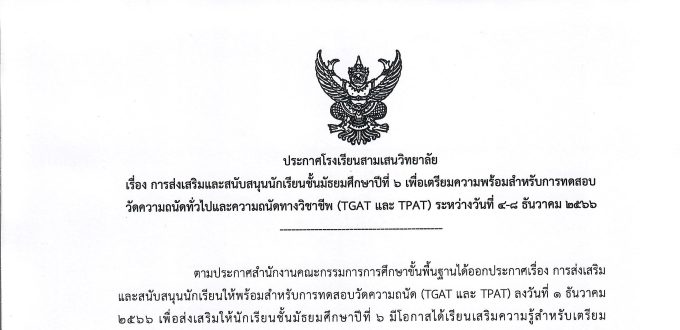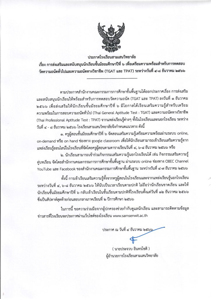 ประกาศโรงเรียนสามเสนวิทยาลัย เรื่อง การส่งเสริมและสนับสนุนนักเรียนชั้นมัธยมศึกษาปีที่ ๖ เพื่อเตรียมความพร้อมสำหรับการทดสอบวัดความถนัดทั่วไปและความถนัดทางวิชาชีพ (TGAT และ TPAT) ระหว่างวันที่ ๔-๘ ธันวาคม ๒๕๖๖