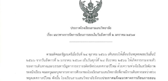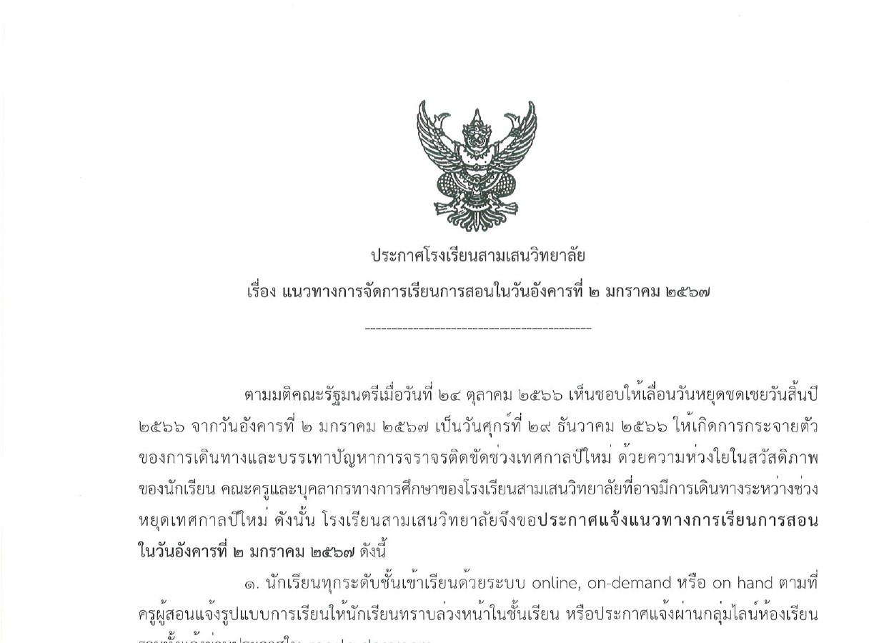 ประกาศโรงเรียนสามเสนวิทยาลัย เรื่อง แนวทางการจัดการเรียนการสอนในวันอังคารที่ ๒ มกราคม ๒๕๖๗ ประกาศแนวทางการจัดการเรียนการสอนในวันอังคารที่ ๒ มกราคม ๒๕๖๗