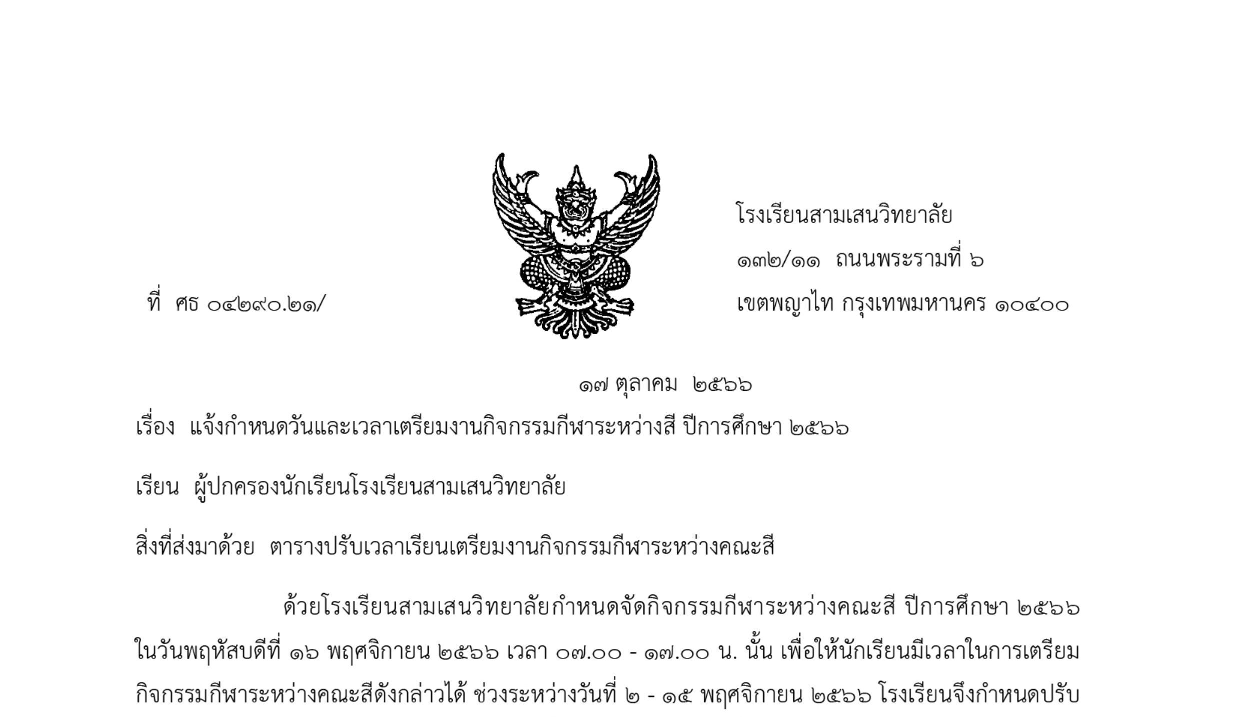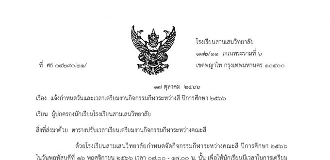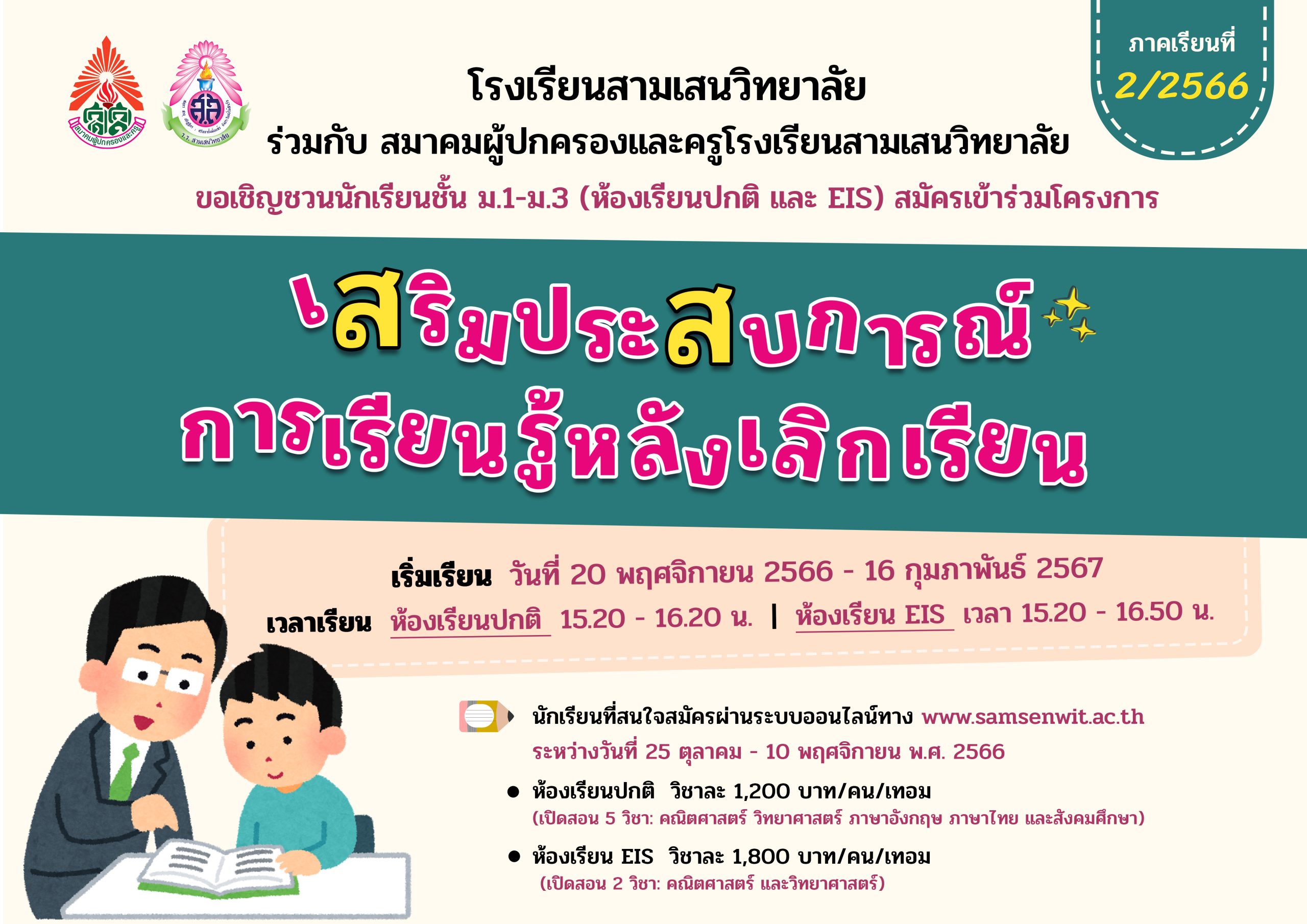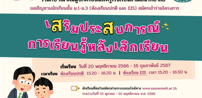 🚩โรงเรียนสามเสนวิทยาลัย ร่วมกับ สมาคมผู้ปกครองและครูโรงเรียนสามเสนวิทยาลัย จัดโครงการเสริมประสบการณ์การเรียนรู้หลังเลิกเรียน ภาคเรียนที่ 2/2566 สำหรับนักเรียนชั้น ม.1-ม.3 (ห้องเรียนปกติ และ EIS) เพื่อเป็นการทบทวนและสอนเสริมความรู้เพิ่มเติมนอกเวลาเรียนให้กับนักเรียน และส่งเสริมให้นักเรียนใช้เวลาว่างให้เกิดประโยชน์ต่อตนเอง พร้อมกับแบ่งเบาภาระในการดูแลบุตรหลานในช่วงเวลาเย็นของผู้ปกครอง โดยมีรายละเอียดดังนี้