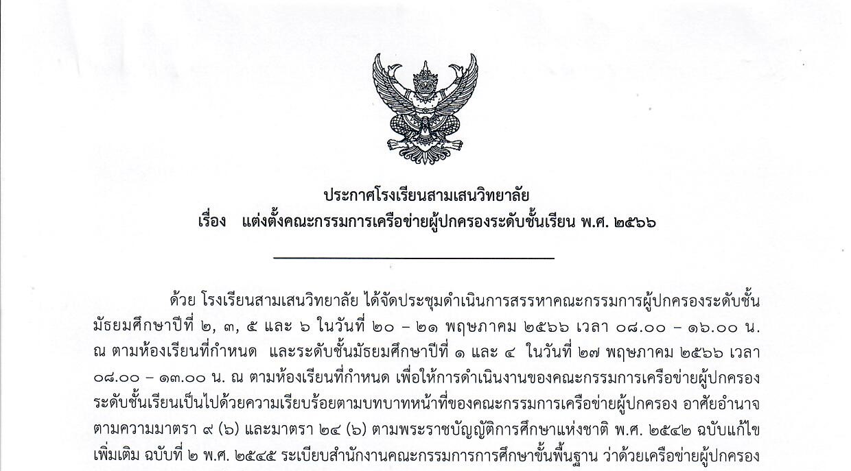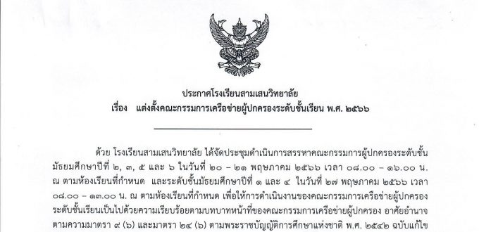 ประกาศโรงเรียนสามเสนวิทยาลัย เรื่อง แต่งตั้งคณะกรรมการเครือข่ายผู้ปกครองระดับชั้นเรียน พ.ศ. 2566 ประกาศแต่งตั้งคณะกรรมการเครือข่ายผู้ปกครองระดับชั้นเรียน พ.ศ. 2566