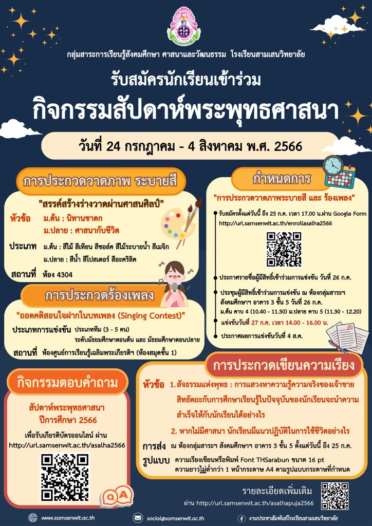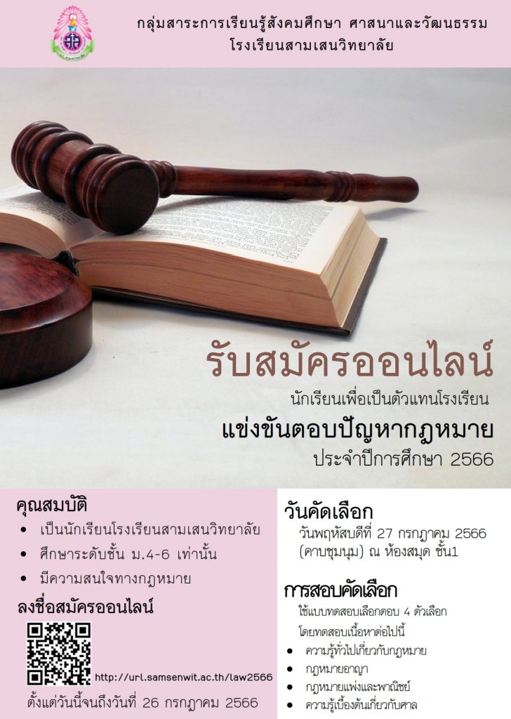 ประชาสัมพันธ์กลุ่มสาระการเรียนรู้สังคมศึกษาฯ โรงเรียนสามเสนวิทยาลัย รับสมัครนักเรียน ม.ปลาย โรงเรียนสามเสนวิทยาลัย คัดเลือกเป็นตัวแทนเข้าแข่งขันตอบปัญหากฎหมายในรายการต่าง ๆ ของปีการศึกษา 2566