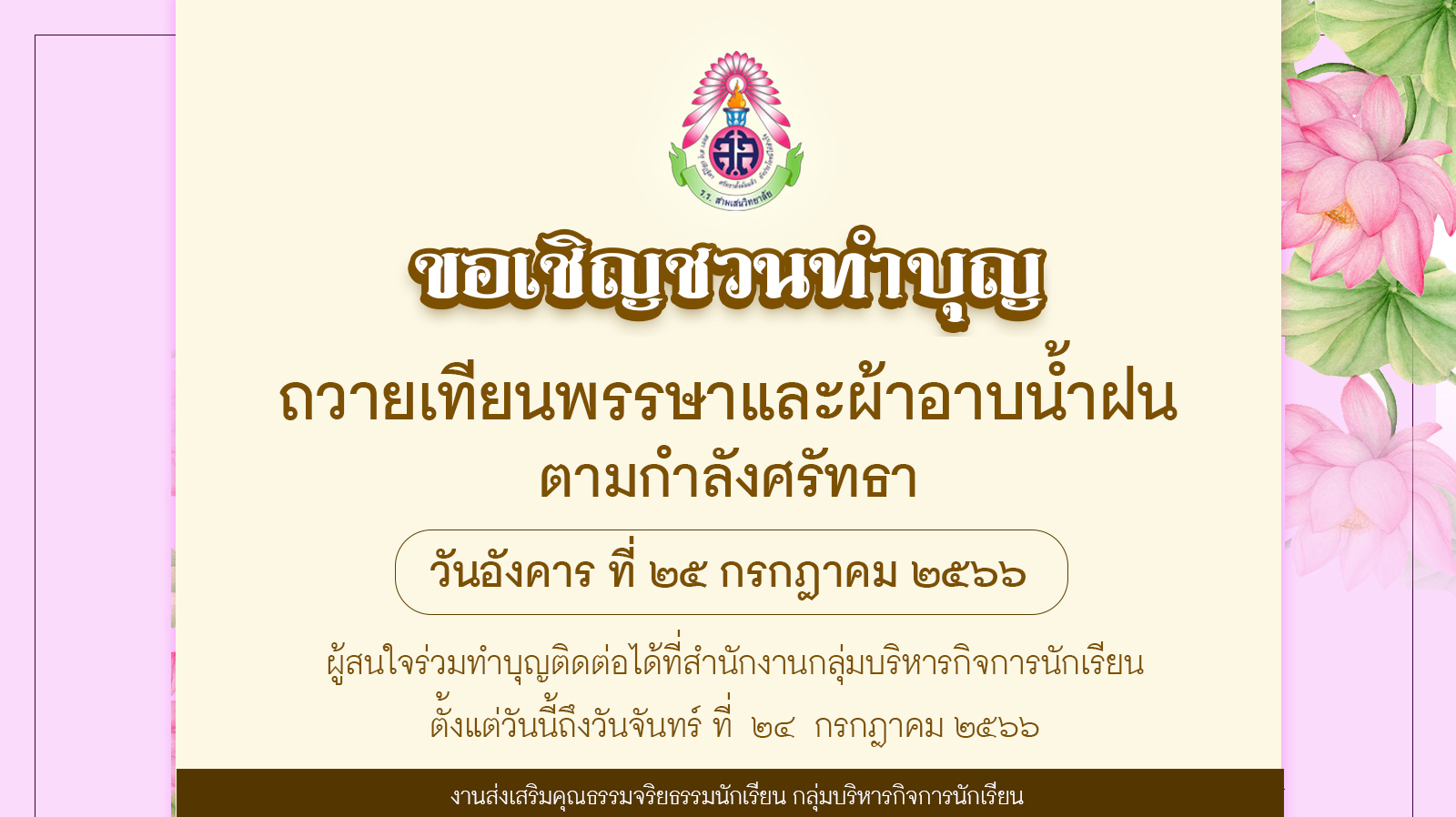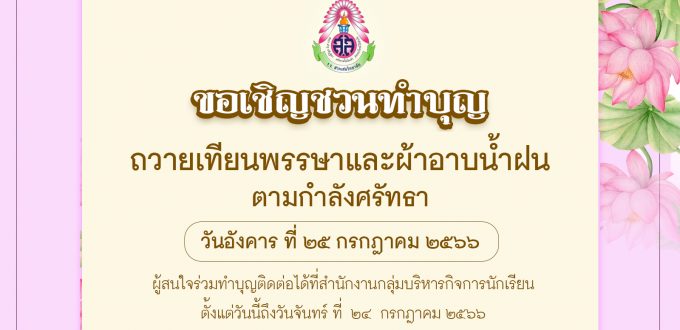 ขอเชิญชวนผู้มีจิตศรัทธาร่วมทำบุญตามกำลังศรัทธา เนื่องในกิจกรรมถวายเทียนพรรษาและผ้าอาบน้ำฝน ณ วัดประชาระบือธรรม