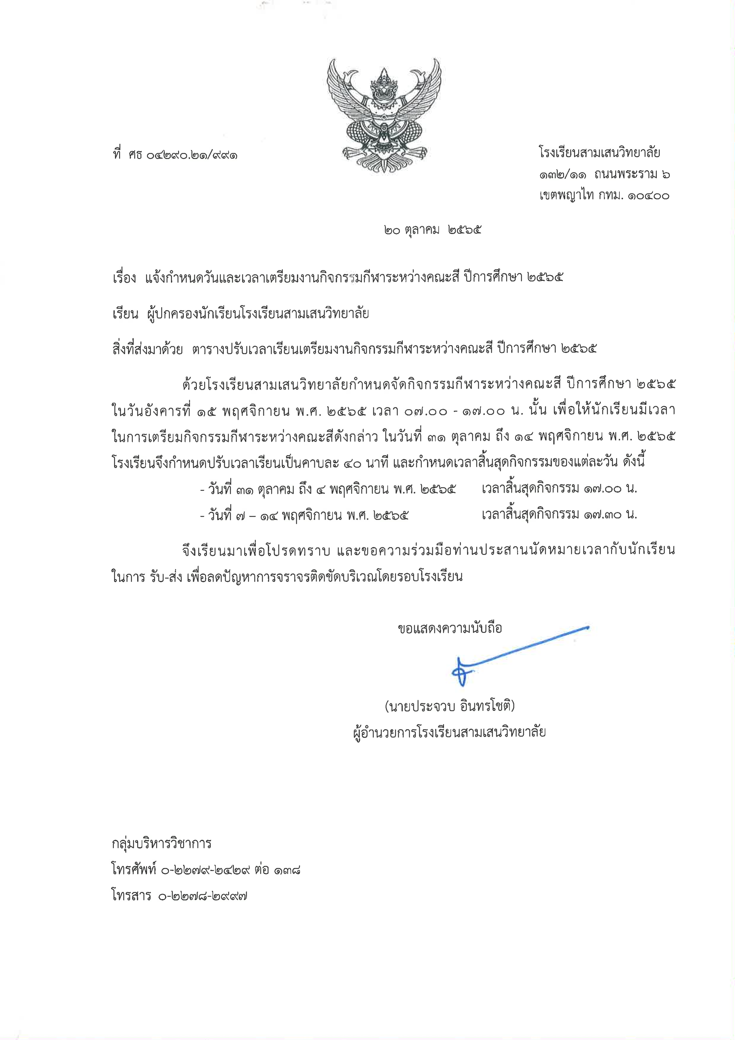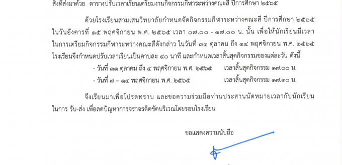 กำหนดวันและเวลาเตรียมงานกิจกรรมกีฬาระหว่างคณะสี ปีการศึกษา 2565