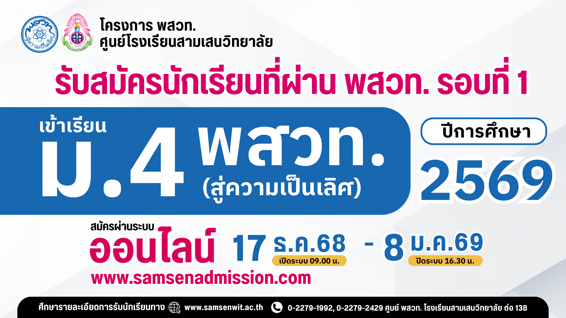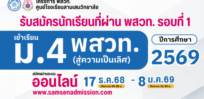 สามารถยื่นสมัครเข้าเรียนระดับชั้น ม.4 ห้องเรียน พสวท. (สู่ความเป็นเลิศ) ศูนย์โรงเรียนสามเสนวิทยาลัย โดยกรอกข้อมูลยื่นสมัคร ผ่านระบบรับสมัครออนไลน์ พร้อมอัปโหลดหลักฐานการสมัคร ระหว่างวันที่ 17 ธันวาคม 2568 – 8 มกราคม 2569