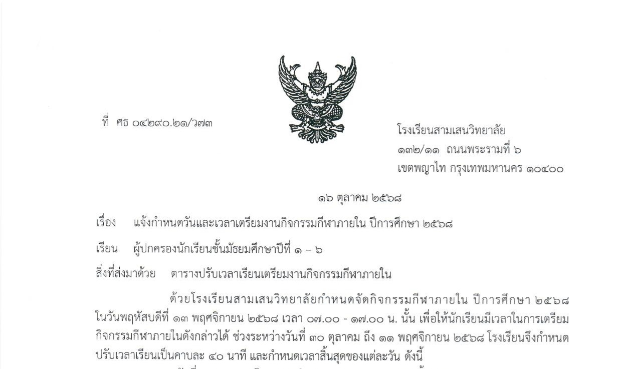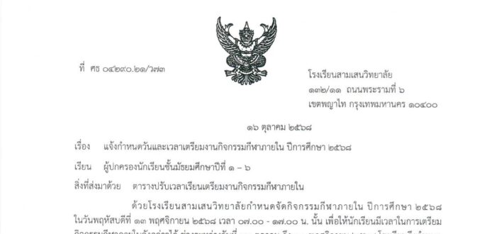 ตารางห้องเรียนนักเรียน ม.1-ม.3 วันจันทร์ที่ 3, 10, 24 พ.ย. และ 1, 15 ธ.ค. 2568 คาบ 8 (กิจกรรมชุมนุม) ของนักเรียนระดับมัธยมศึกษาตอนต้น ไม่มีการเรียนการสอน ให้นักเรียนพบครูที่ปรึกษาในห้องเรียนที่กำหนดไว้
