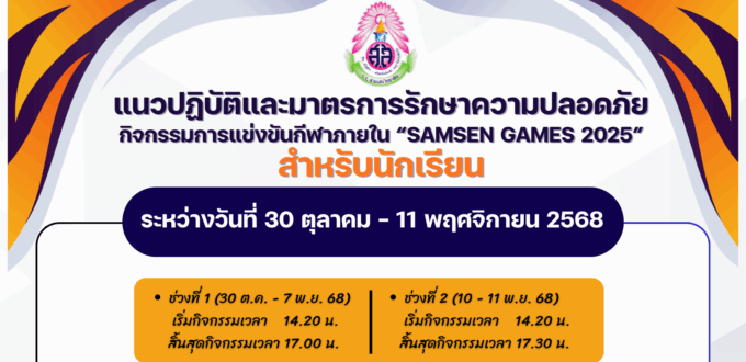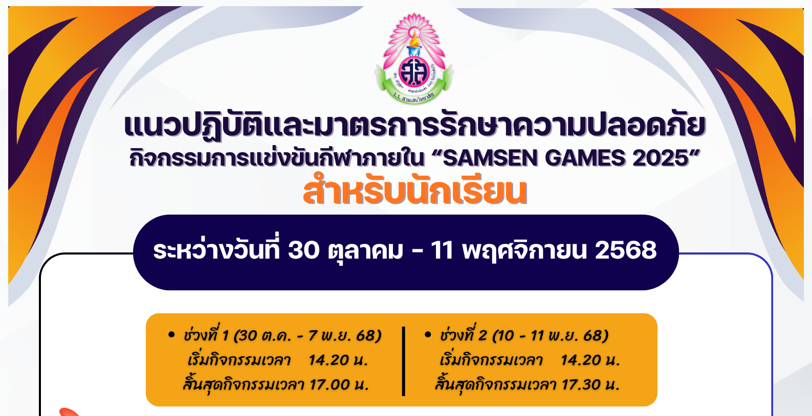 แนวปฏิบัติและมาตรการรักษาความปลอดภัย กิจกรรมการแข่งขันกีฬาภายใน “SAMSEN GAMES 2025” ระหว่างวันที่ 30 ตุลาคม – 13 พฤศจิกายน 2568 สำหรับนักเรียนโรงเรียนสามเสนวิทยาลัย ผู้ปกครองนักเรียนปัจจุบันและศิษย์เก่าที่เข้าร่วมชมกิจกรรมในวันที่ 13 พฤศจิกายน 2568