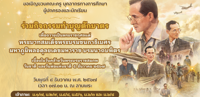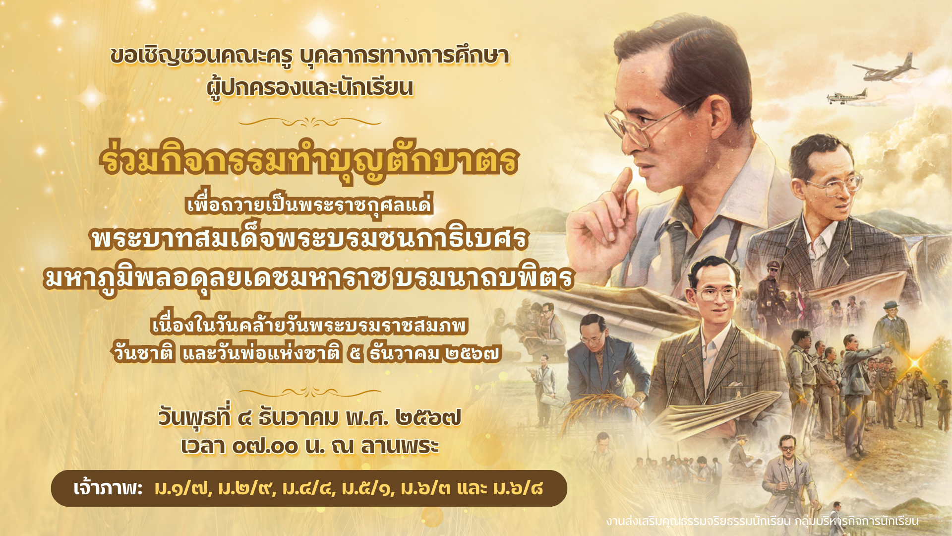 ขอเชิญชวนคณะครู บุคลากรทางการศึกษา ผู้ปกครองและนักเรียน ร่วมกิจกรรมทำบุญตักบาตร 🙏 เพื่อถวายเป็นพระราชกุศลแด่พระบาทสมเด็จพระบรมชนกาธิเบศร มหาภูมิพลอดุลยเดชมหาราช บรมนาถบพิตร เนื่องในวันคล้ายวันพระบรมราชสมภพ วันชาติ และวันพ่อแห่งชาติ ๕ ธันวาคม ๒๕๖๗