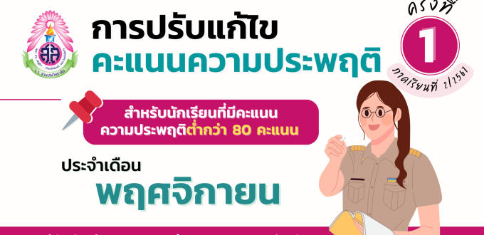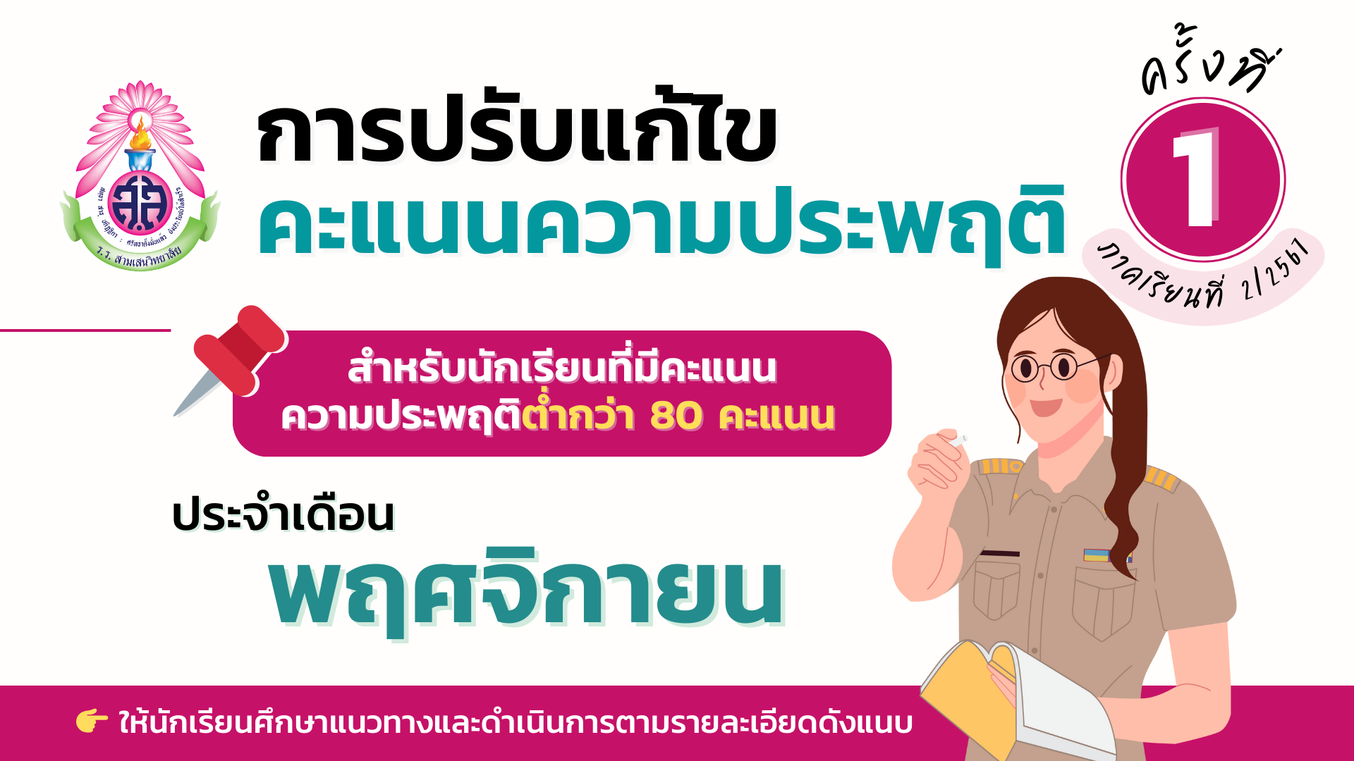 กิจกรรมการปรับแก้ไขคะแนนความประพฤติสำหรับนักเรียนที่มีคะแนนความประพฤติต่ำกว่า 80 คะแนน ครั้งที่ 1 ภาคเรียนที่ 2 ปีการศึกษา 2567 ประจำเดือน พฤศจิกายน ให้นักเรียนศึกษาแนวทางและดำเนินการตามรายละเอียด ดังแนบ https://drive.google.com/…/1NiKbAzd4PW9AqIeOMzh4kHo15Ur… ส่งแบบลงทะเบียนขอปรับแก้ไขคะแนนความประพฤติ (กจ 2- 4) ภายในวันที่ 4 พฤศจิกายน 2567 ส่งแบบรายงานการขอปรับแก้ไขคะแนนความประพฤติจากการมาสาย (กจ 2- 5) ตลอดภาคเรียน ส่งแบบรายงานการขอปรับแก้ไขคะแนนความประพฤติจากพฤติกรรมอื่นๆ (กจ 2- 6) ภายในวันที่ 3 ธันวาคม 2567