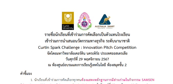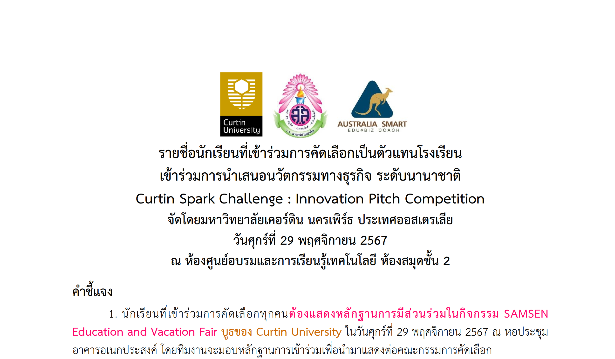 ประกาศรายชื่อนักเรียนที่เข้าร่วมการคัดเลือกเป็นตัวแทนโรงเรียนเข้าร่วมการนำเสนอนวัตกรรมทางธุรกิจ ระดับนานาชาติ Curtin Spark Challenge : Innovation Pitch Competition จัดโดยมหาวิทยาลัยเคอร์ติน นครเพิร์ธ ประเทศออสเตรเลีย วันศุกร์ ที่ 29 พฤศจิกายน 2567 ณ ห้องศูนย์อบรมและการเรียนรู้เทคโนโลยี ห้องสมุดชั้น 2 รายชื่อนักเรียนที่เข้าร่วมการคัดเลือก Curtin Spark Challenge
