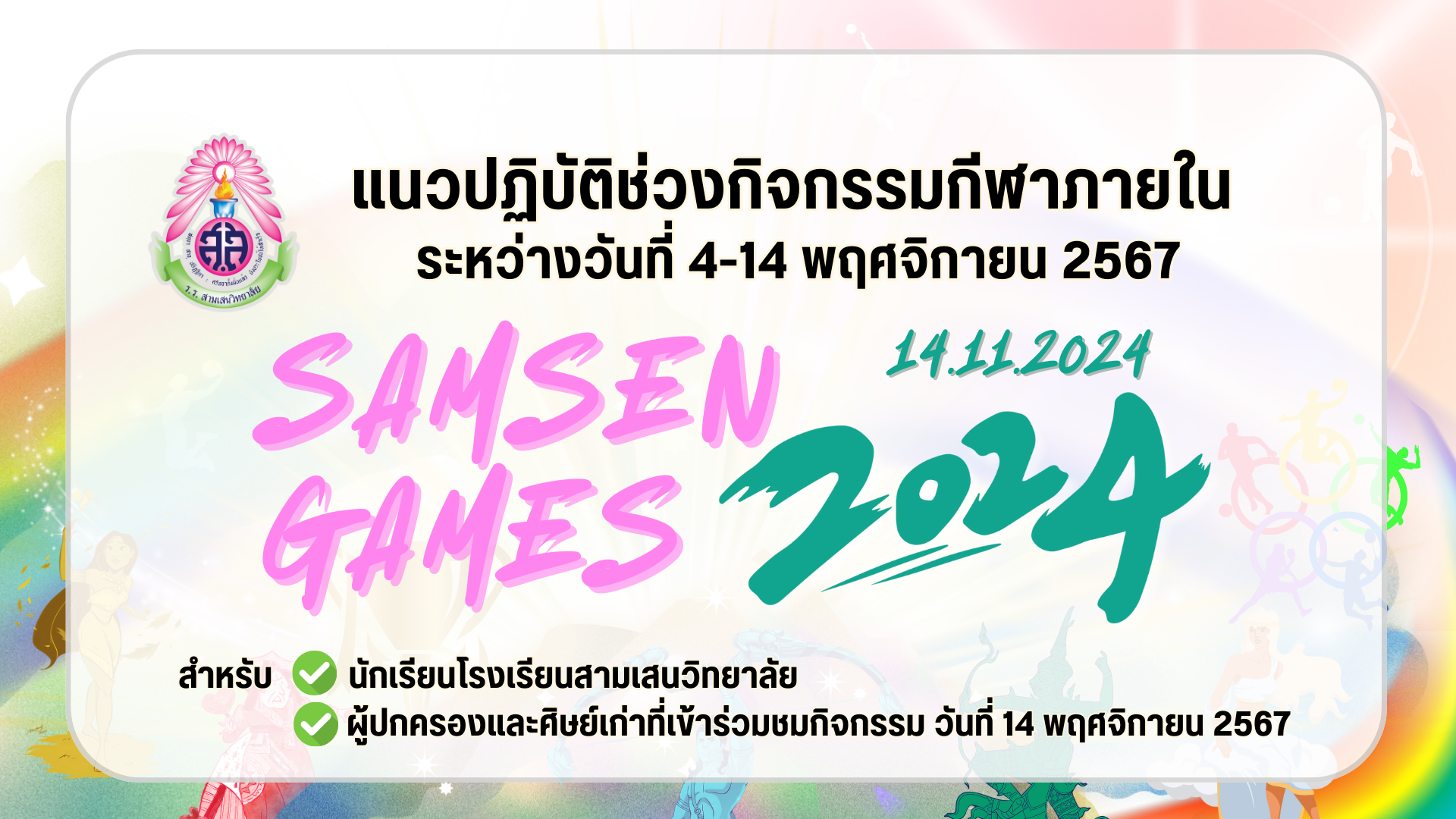 แนวปฏิบัติช่วงกิจกรรมกีฬาภายใน “SAMSEN GAMES 2024” ระหว่างวันที่ 4-14 พฤศจิกายน 2567 สำหรับ นักเรียนโรงเรียนสามเสนวิทยาลัย ผู้ปกครองและศิษย์เก่าที่เข้าร่วมชมกิจกรรม วันที่ 14 พฤศจิกายน 2567 📥 2567-แนวปฏิบัติช่วงกิจกรรมกีฬาภายใน-นักเรียน-ผู้ปกครอง-ศิษย์เก่า