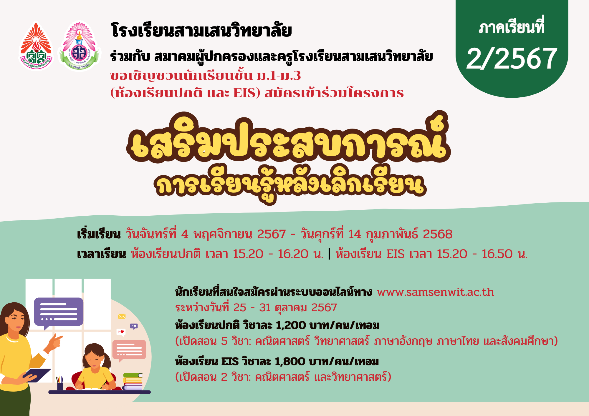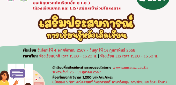 โรงเรียนสามเสนวิทยาลัย ร่วมกับ สมาคมผู้ปกครองและครูโรงเรียนสามเสนวิทยาลัย จัดโครงการเสริมประสบการณ์การเรียนรู้หลังเลิกเรียน สำหรับนักเรียนชั้น ม.1-ม.3 (ห้องเรียนปกติ และ EIS) เพื่อเป็นการทบทวนและสอนเสริมความรู้เพิ่มเติมนอกเวลาเรียนให้กับนักเรียน และส่งเสริมให้นักเรียนใช้เวลาว่างให้เกิดประโยชน์ต่อตนเอง พร้อมกับแบ่งเบาภาระในการดูแลบุตรหลานในช่วงเวลาเย็นของผู้ปกครอง โดยมีรายละเอียดดังนี้