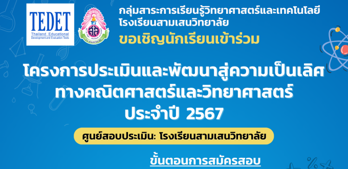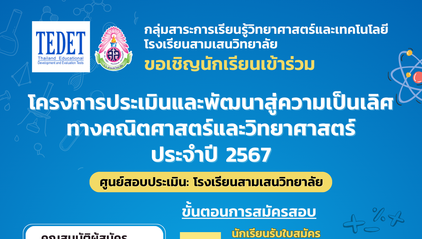 กลุ่มสาระการเรียนรู้วิทยาศาสตร์และเทคโนโลยี โรงเรียนสามเสนวิทยาลัย ขอเชิญนักเรียนระดับชั้นมัธยมศึกษาปีที่ 1-3 เข้าร่วมโครงการประเมินและพัฒนาสู่ความเป็นเลิศ ทางคณิตศาสตร์และวิทยาศาสตร์ ประจำปี 2567 (TEDET) เปิดรับสมัครตั้งแต่วันนี้ถึงวันที่ 25 กรกฎาคม 2567 กลุ่มสาระการเรียนรู้วิทยาศาสตร์และเทคโนโลยี โรงเรียนสามเสนวิทยาลัย