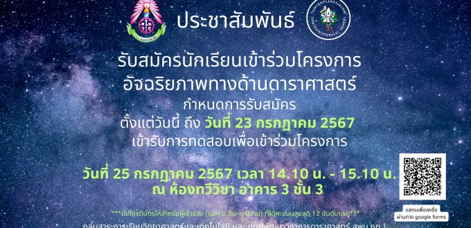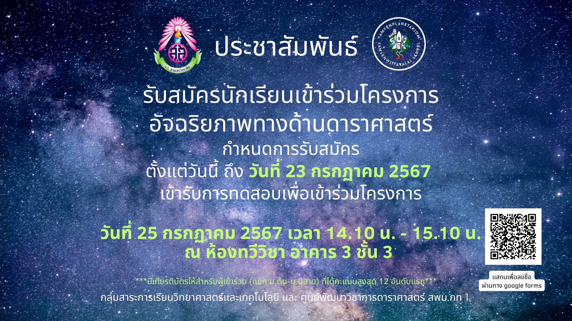 กลุ่มสาระฯ วิทยาศาสตร์และเทคโนโลยี และศูนย์พัฒนาวิชาการดาราศาสตร์ สพม. กท 1 รับสมัครนักเรียนเข้าร่วมโครงการอัจฉริยภาพด้านดาราศาสตร์ ตั้งแต่วันนี้ถึงวันที่ 23 กรกฏาคม 2567