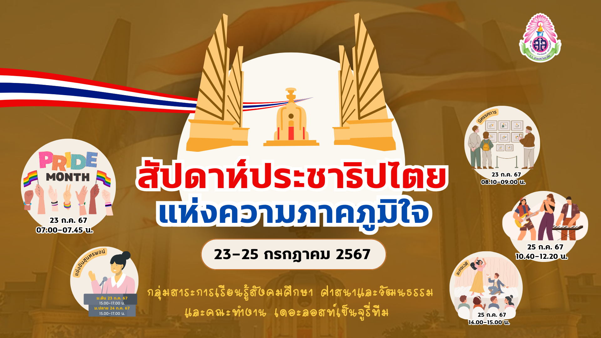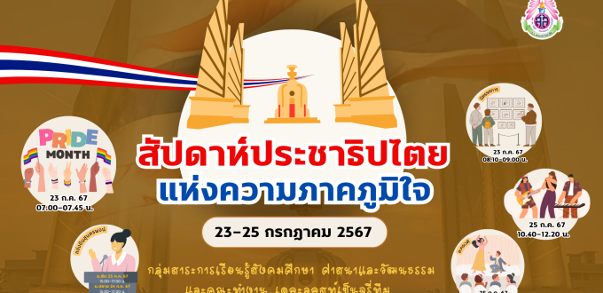 กลุ่มสาระการเรียนรู้สังคมศึกษา ศาสนาและวัฒนธรรม ขอเชิญชวนคณะผู้บริหาร ครู บุคลากรและนักเรียน ร่วมงาน “สัปดาห์ประชาธิปไตย แห่งความภาคภูมิใจ” ระหว่างวันที่ 23-25 กรกฎาคม 2567
