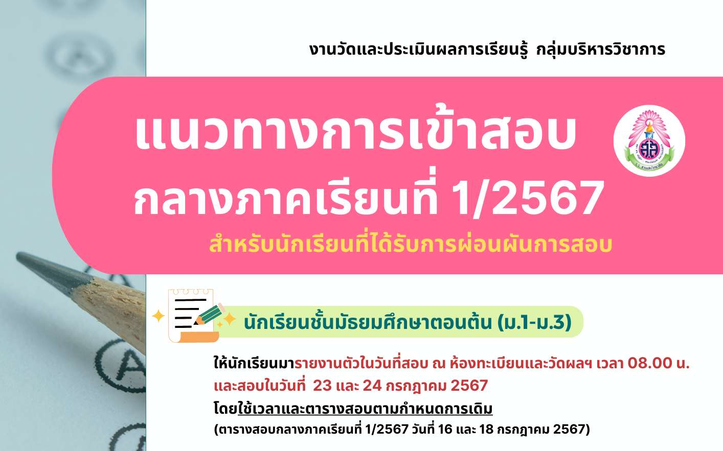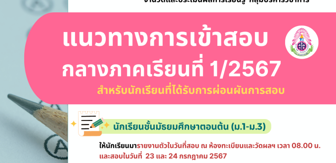 แนวทางการเข้าสอบกลางภาคเรียนที่ 1 ปีการศึกษา 2567 สำหรับนักเรียนที่ได้รับการผ่อนผันการสอบ โดย งานวัดและประเมินผลการเรียนรู้ กลุ่มบริหารวิชาการ