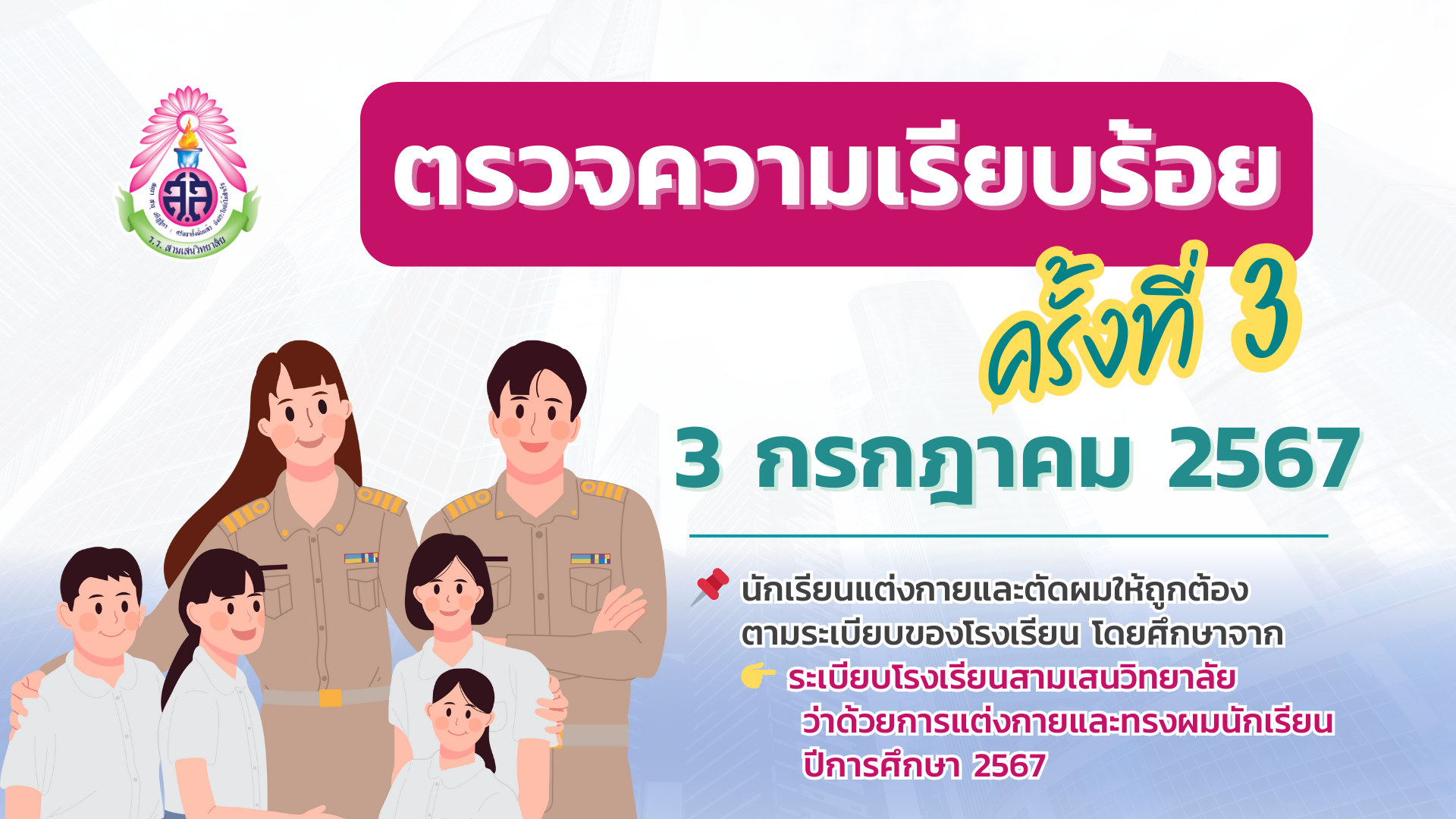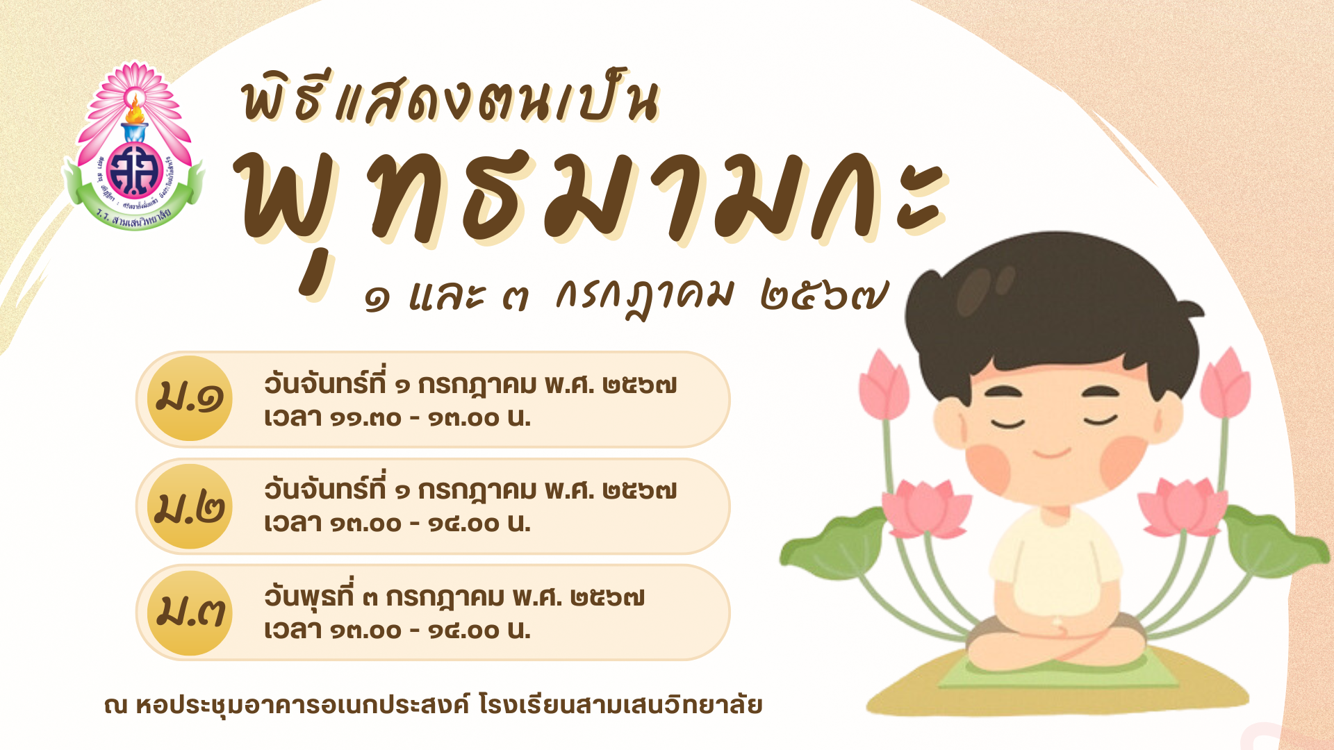 กำหนดการพิธีแสดงตนเป็นพุทธมามกะ ระดับชั้นมัธยมศึกษาปีที่ 1-3 วันที่ 1 และ 3 กรกฎาคม 2567 ณ หอประชุมอาคารอเนกประสงค์โรงเรียนสามเสนวิทยาลัย