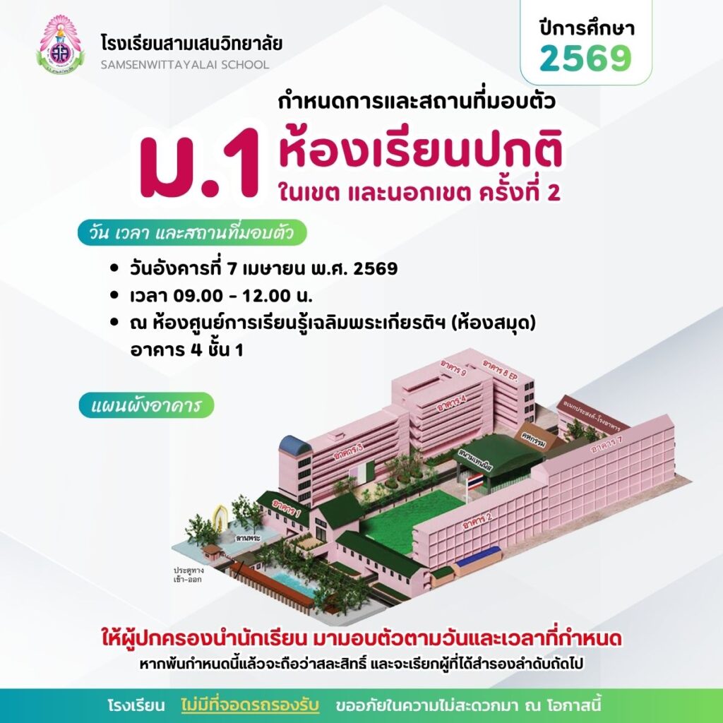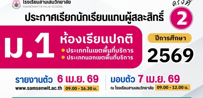 🟦 นักเรียนที่ไม่ประสงค์เข้าศึกษาต่อระดับชั้น ม.1 และ ม.4 โรงเรียนสามเสนวิทยาลัย ปีการศึกษา 2569 สามารถยื่นคำร้องขอสละสิทธิ์ทางอีเมล education@samsenwit.ac.th
