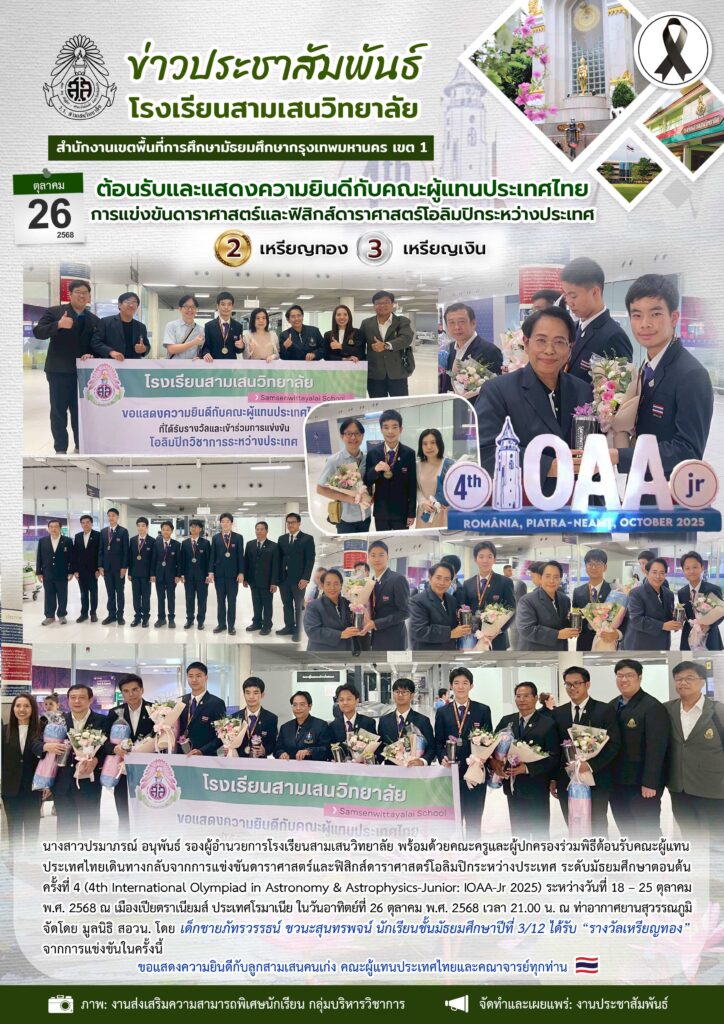 26 ตุลาคม 2568 สามเสนวิทยาลัย ร่วมต้อนรับและแสดงความยินดีกับคณะผู้แทนประเทศไทยการแข่งขันดาราศาสตร์และฟิสิกส์ดาราศาสตร์โอลิมปิกระหว่างประเทศ (IOAA-Jr 2025)
