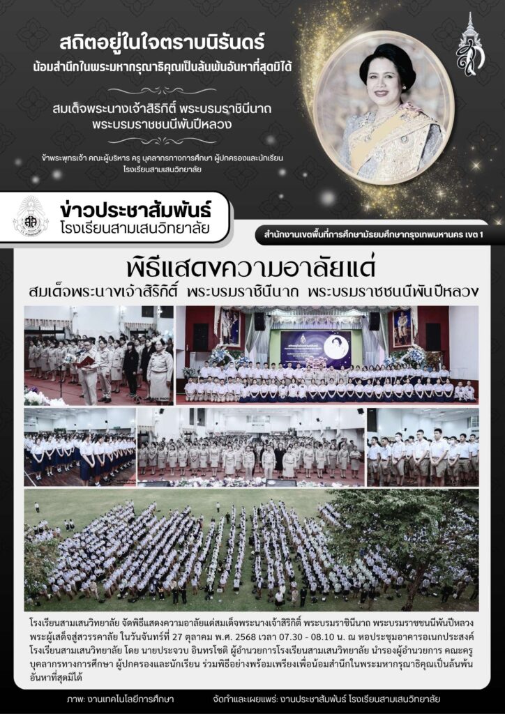 27 ตุลาคม 2568 พิธีแสดงความอาลัยแด่สมเด็จพระนางเจ้าสิริกิติ์ พระบรมราชินีนาถ พระบรมราชชนนีพันปีหลวง เพื่อน้อมสำนึกในพระมหากรุณาธิคุณเป็นล้นพ้นอันหาที่สุดมิได้