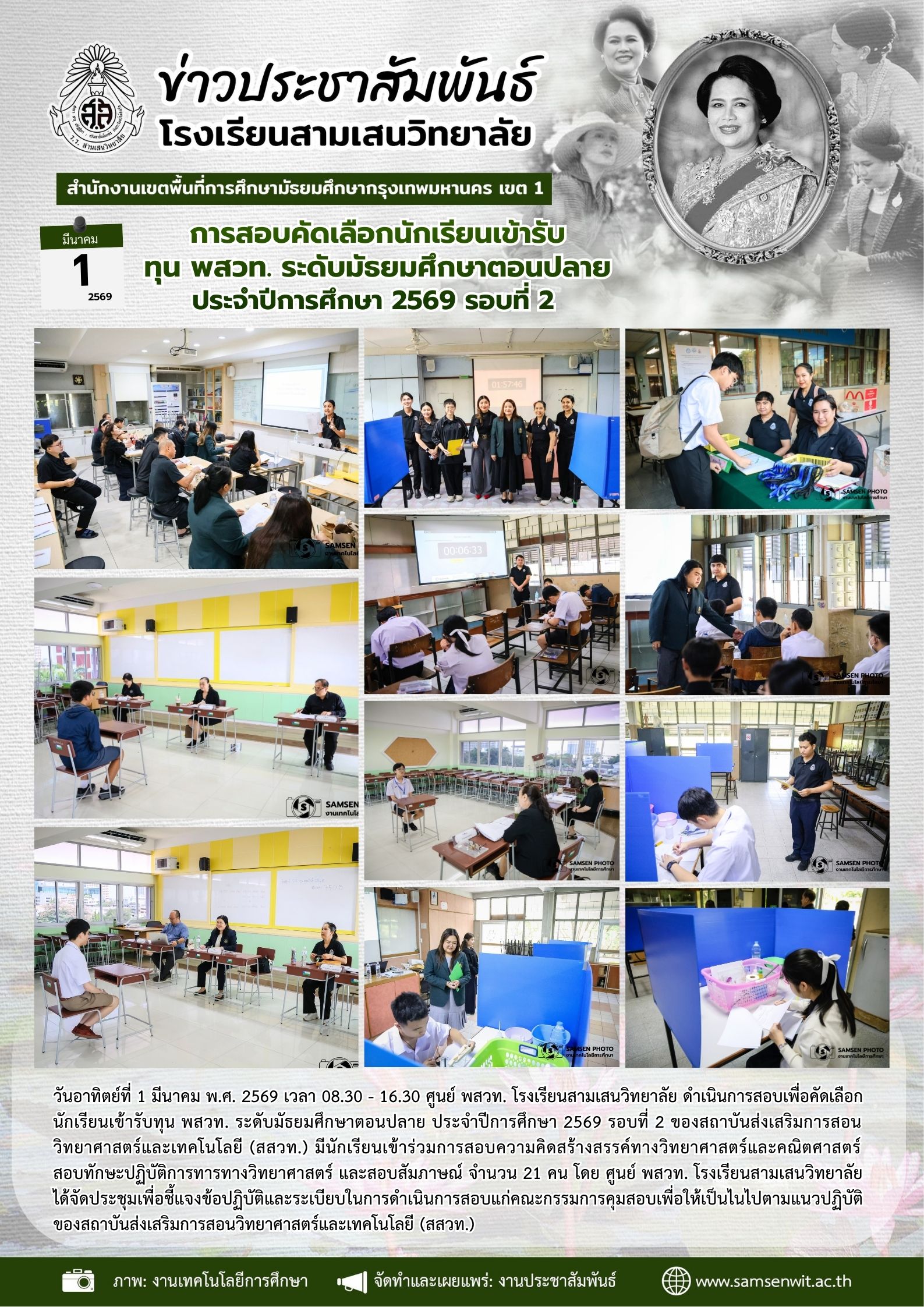 1 มีนาคม 2569 การสอบคัดเลือกนักเรียนเข้ารับ ทุน พสวท. ระดับมัธยมศึกษาตอนปลาย ประจำปีการศึกษา 2569 รอบที่ 2