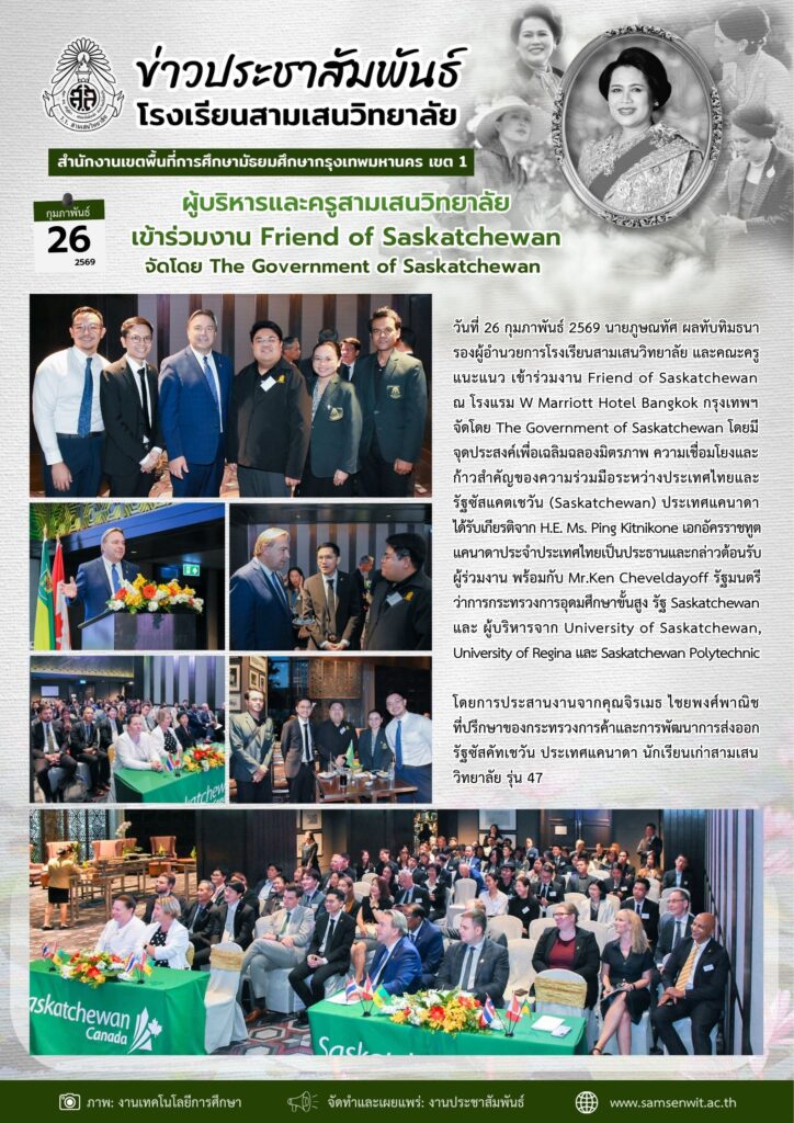 26 กุมภาพันธ์ 2569 ผู้บริหารและครูสามเสนวิทยาลัย เข้าร่วมงาน Friend of Saskatchewan จัดโดย The Government of Saskatchewan