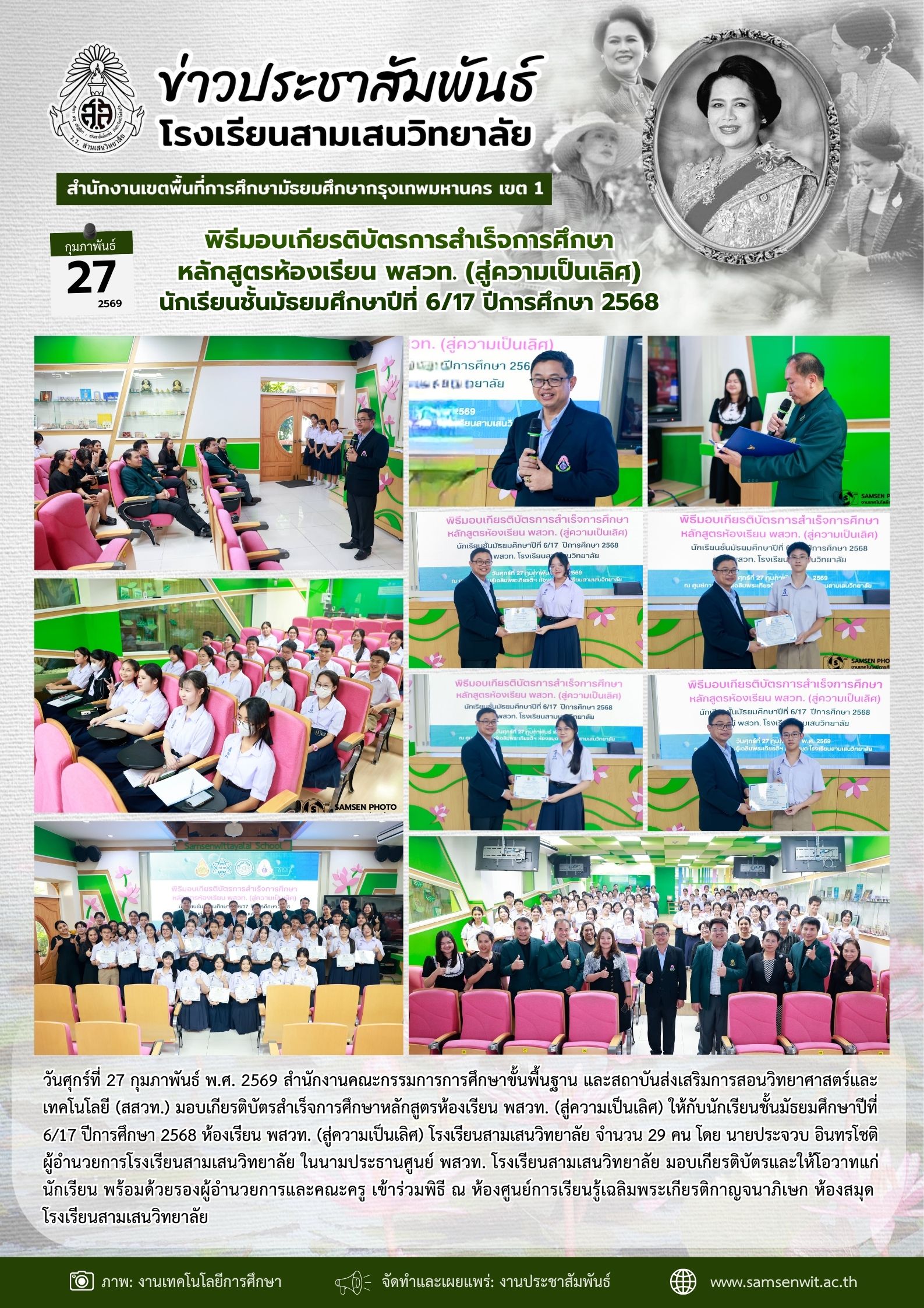 27 กุมภาพันธ์ 2569 พิธีมอบเกียรติบัตรการสำเร็จการศึกษา หลักสูตรห้องเรียน พสวท. (สู่ความเป็นเลิศ) นักเรียนชั้นมัธยมศึกษาปีที่ 6/17 ปีการศึกษา 2568