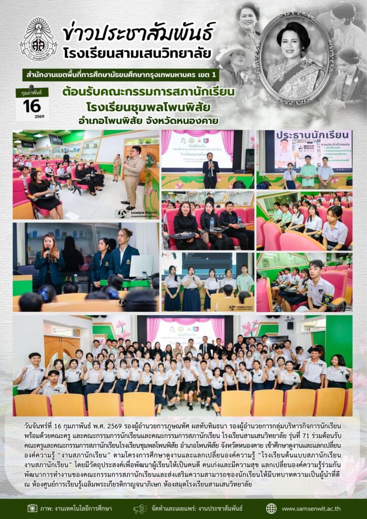 6 กุมภาพันธ์ 2569 คณาจารย์และนักศึกษา สาขาวิชานวัตกรรมการบริหารการศึกษา บัณฑิตวิทยาลัยศึกษาศาสตร์ มหาวิทยาลัยสยาม ศึกษาดูงาน “การบริหารจัดการสถานศึกษาและการประกันคุณภาพการศึกษาของโรงเรียนสามเสนวิทยาลัย
