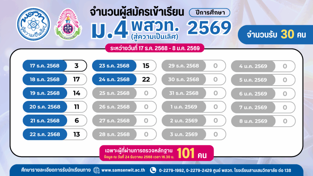 จำนวนผู้สมัครเข้าเรียน ระดับชั้น ม.4 ห้องเรียน พสวท. (สู่ความเป็นเลิศ) ปีการศึกษา 2569 ระหว่างวันที่ 17 ธ.ค. 2568 – 8 ม.ค. 2569 (เฉพาะผู้ที่ผ่านการตรวจหลักฐาน)