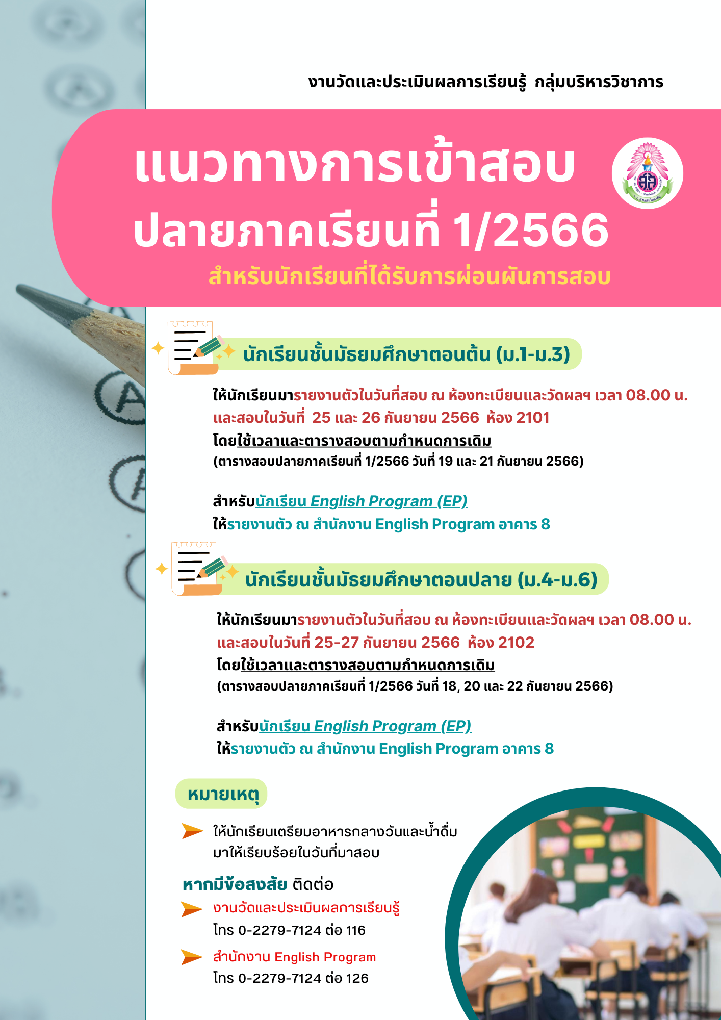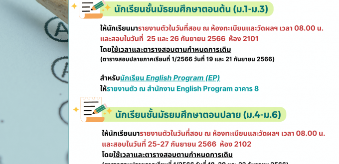 แนวทางการเข้าสอบปลายภาคเรียนที่ 1/2566 สำหรับนักเรียนที่ได้รับการผ่อนผันการสอบ โดย งานวัดและประเมินผลการเรียนรู้ กลุ่มบริหารวิชาการ