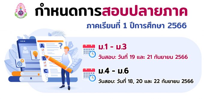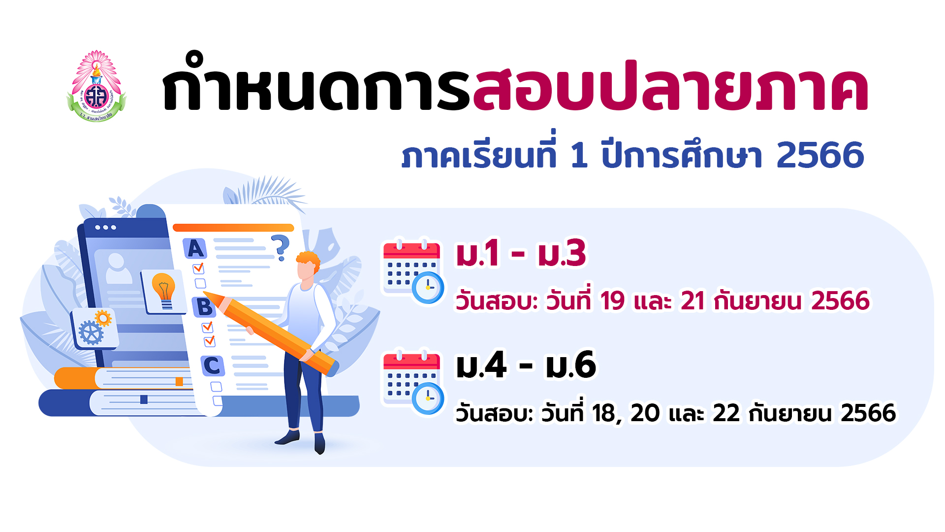 กำหนดการและตารางสอบปลายภาคเรียนที่ 1 ปีการศึกษา 2566 ชั้นมัธยมศึกษาปีที่ 1-6 ระหว่างวันที่ 18-22 กันยายน 2566 📝 หนังสือแจ้งผู้ปกครอง เรื่องกำหนดการสอบปลายภาค ภาคเรียนที่ 1 ปีการศึกษา 2566 👉 ตารางสอบและห้องสอบ ม.1 – ม.6 (ห้องเรียนปกติ/ห้องเรียนพิเศษ) 👉 ตารางสอบและห้องสอบ ม.1 – ม.6 (English Program)