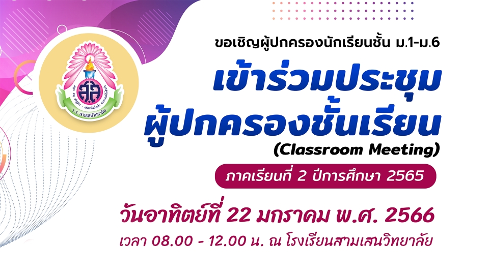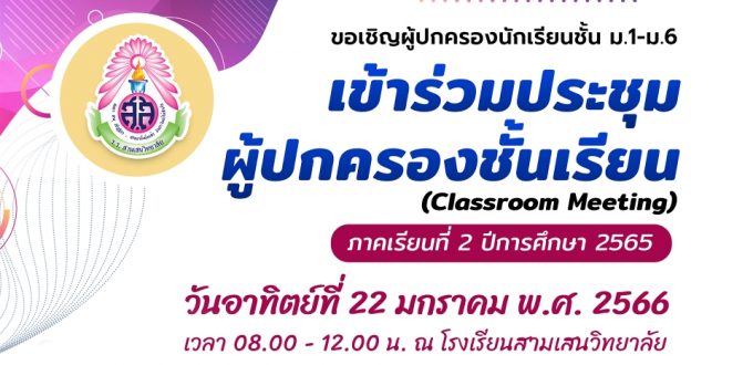 ขอเชิญผู้ปกครองนักเรียนชั้น ม.1-ม.6 เข้าร่วมประชุมผู้ปกครองชั้นเรียน (Classroom Meeting) ภาคเรียนที่ 2 ปีการศึกษา 2565 ในวันอาทิตย์ที่ 22 มกราคม พ.ศ. 2566 เวลา 08.00-12.00 น. ณ โรงเรียนสามเสนวิทยาลัย