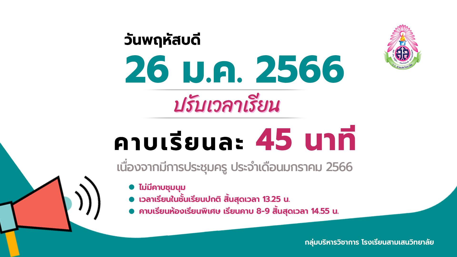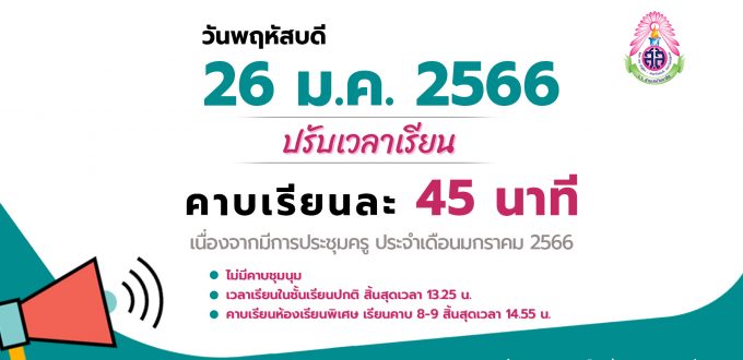 แจ้งการปรับเปลี่ยนเวลาเรียน ในวันพฤหัสบดีที่ 26 มกราคม พ.ศ. 2566 เป็นคาบเรียนละ 45 นาที เนื่องจากมีการประชุมครูประจำเดือน มกราคม 2566 แจ้งการปรับเปลี่ยนเวลาเรียน 26 มกราคม 2566