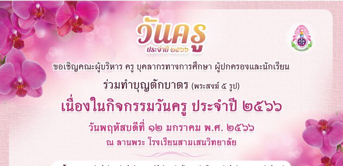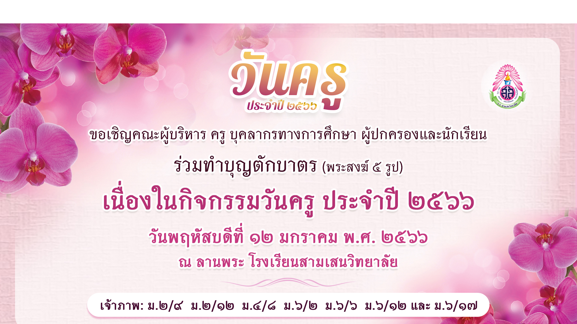 📣 ขอเชิญคณะผู้บริหาร ครู บุคลากรทางการศึกษา ผู้ปกครองและนักเรียนร่วม 🙏 ทำบุญตักบาตร (พระสงฆ์ ๕ รูป) เนื่องในกิจกรรมวันครู ประจำปี ๒๕๖๖ 👩🏫👨🏫ในวันพฤหัสบดีที่ ๑๒ มกราคม พ.ศ. ๒๕๖๖ ณ ลานพระ โรงเรียนสามเสนวิทยาลัย