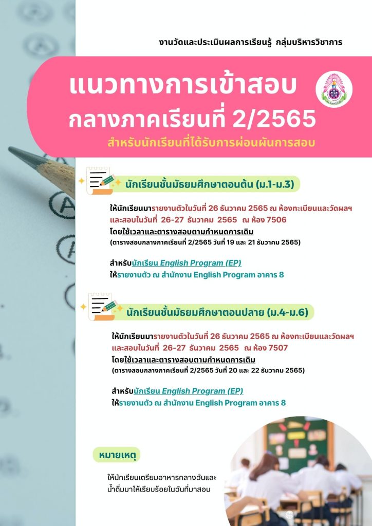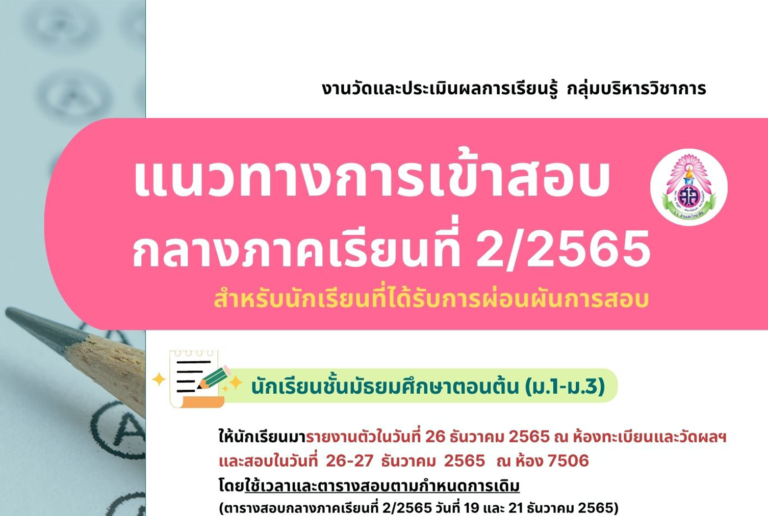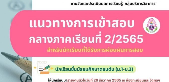 แนวทางการเข้าสอบกลางภาคเรียนที่ 2 ปีการศึกษา 2565 สำหรับนักเรียนที่ได้รับการผ่อนผันการสอบ โดย งานวัดและประเมินผลการเรียนรู้ กลุ่มบริหารวิชาการ