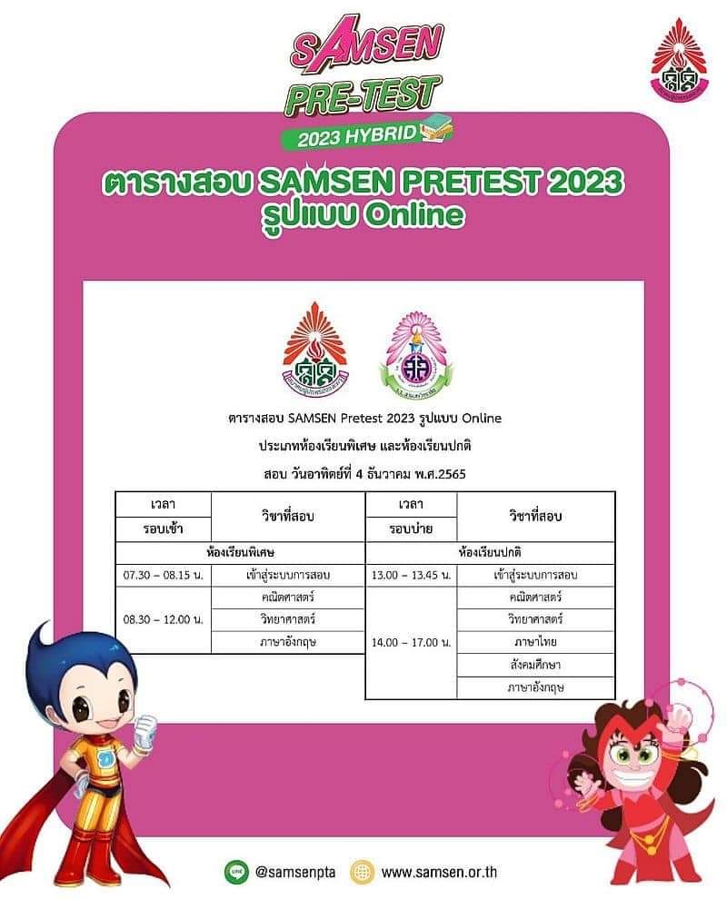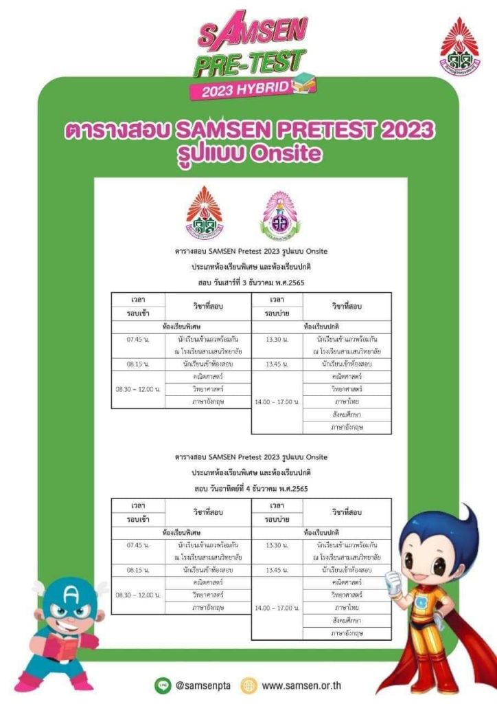 📣เรียน ผู้สมัครสอบ Samsen Pretest 2023 ทุกท่าน ให้ทุกท่านเข้าศึกษาข้อปฏิบัติสำหรับผู้สอบ และตารางสอบ ตามรูปแนบด้านล่าง หรือ สามารถเข้าดูข้อมูลได้ที่ www.samsenpretest.com