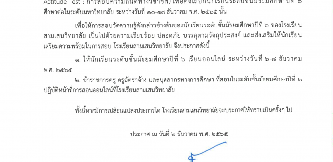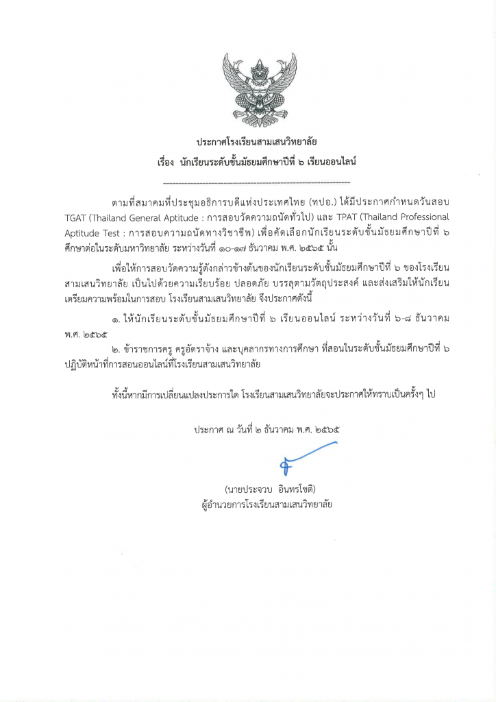 ประกาศโรงเรียนสามเสนวิทยาลัย เรื่อง นักเรียนระดับชั้นมัธยมศึกษาปีที่ 6 เรียนออนไลน์ ในวันที่ 6-8 ธันวาคม พ.ศ. 2565