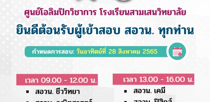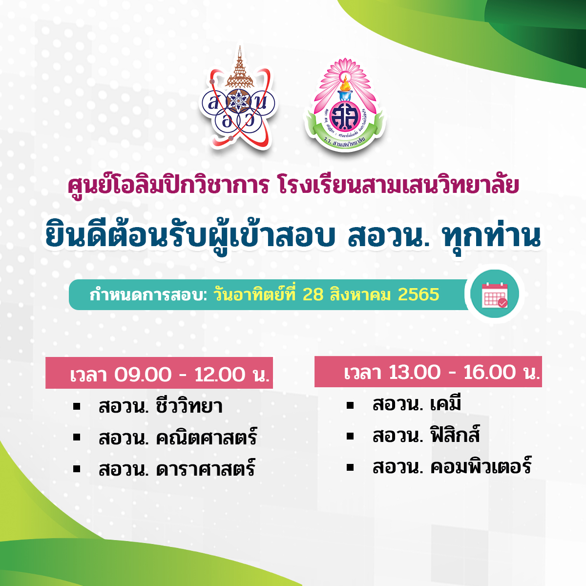 🚩วันอาทิตย์ที่ 28 สิงหาคม พ.ศ. 2565 โรงเรียนสามเสนวิทยาลัย เป็นสนามสอบโอลิมปิกวิชาการ สอวน. เพื่อคัดเลือกนักเรียนเข้าอบรมค่าย 1 ปีการศึกษา 2565 ตามกำหนดการ ดังนี้