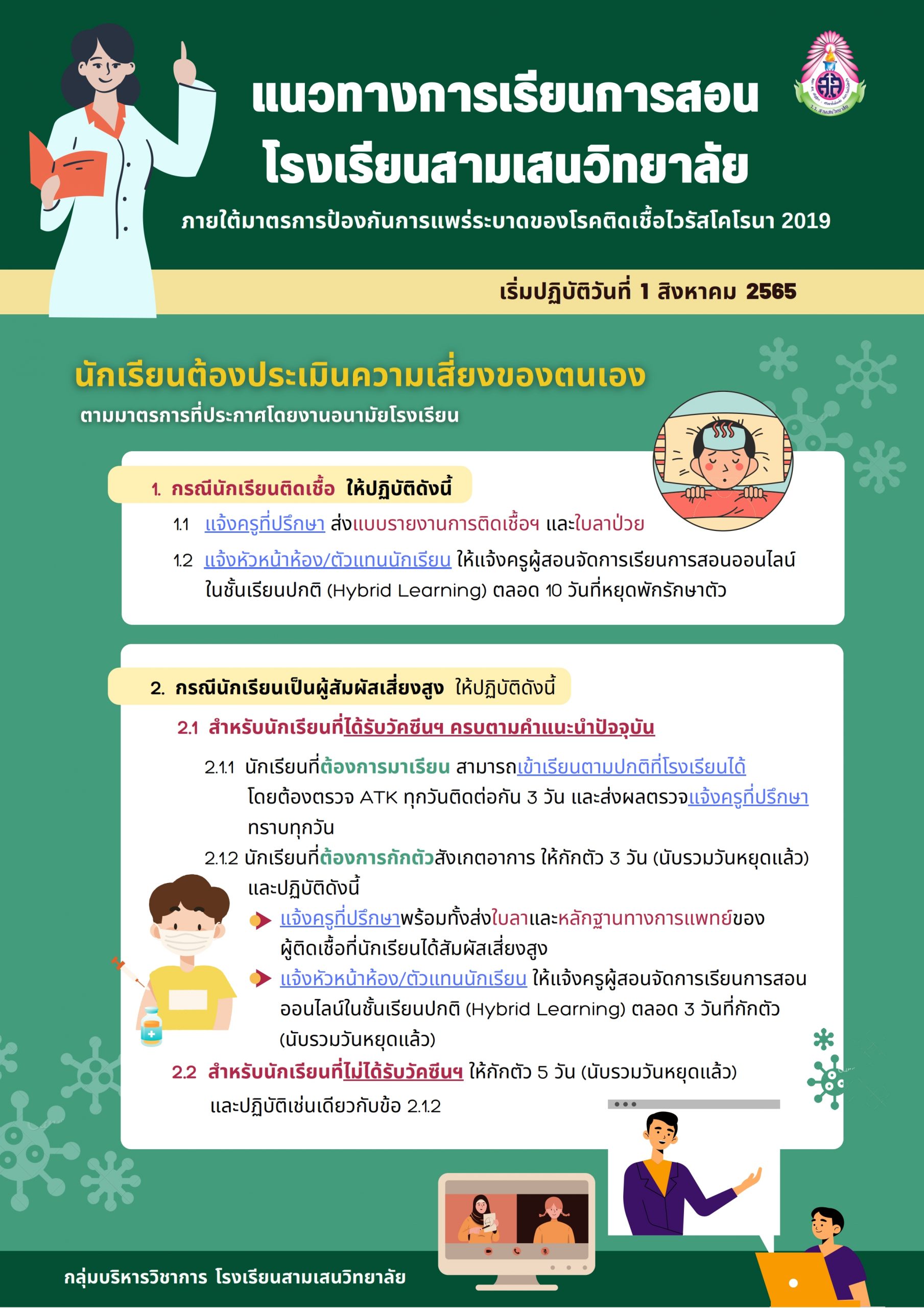 📌นักเรียนต้องประเมินความเสี่ยงของตนเอง ตามมาตรการที่ประกาศโดยงานอนามัยโรงเรียน (ดังแนบ) https://www.samsenwit.ac.th/12874.html