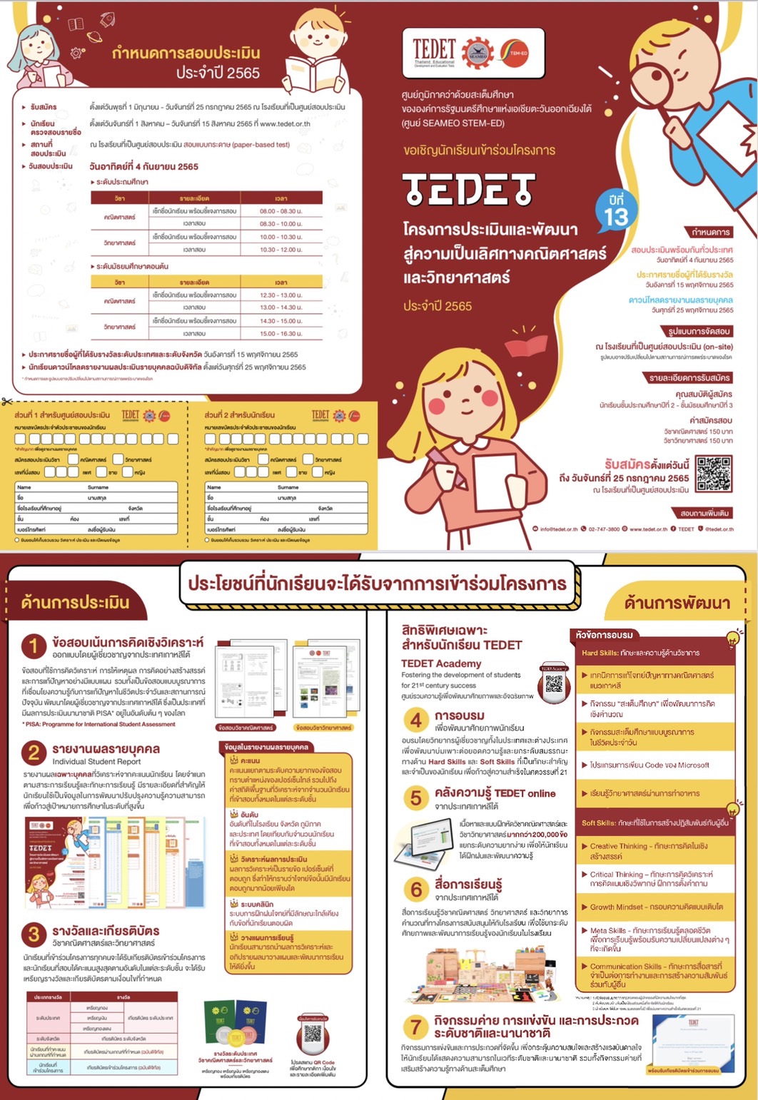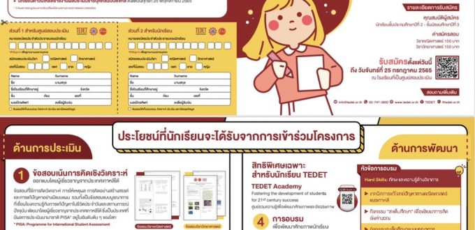 ศูนย์ภูมิภาคว่าด้วยสะเต็มศึกษาขององค์การรัฐมนตรีศึกษาแห่งเอเชียตะวันออกเฉียงใต้ (ศูนย์ SEAMEO STEM-ED) ขอเชิญนักเรียนที่กำลังศึกษาอยู่ในระดับชั้น ม.1 – ม.3 เข้าร่วมโครงการประเมินและพัฒนาสู่ความเป็นเลิศทางคณิตศาสตร์และวิทยาศาสตร์ (TEDET) ครั้งที่ 13 ประจำปี 2565 เพื่อพัฒนาศักยภาพและอัจฉริยภาพของนักเรียนในการแก้โจทย์ปัญหาที่เน้นการคิดวิเคราะห์ การให้เหตุผล การคิดอย่างสร้างสรรค์ และการแก้ปัญหาอย่างมีแบบแผน ในวิชาคณิตศาสตร์และวิทยาศาสตร์ โดยใช้ข้อสอบจากประเทศเกาหลีใต้ ซึ่งนักเรียนจะได้รับรายงานผลการประเมินรายบุคคลฉบับดิจิทัล ที่มีรายละเอียดสำคัญให้นักเรียนใช้เป็นข้อมูลในการพัฒนาปรับปรุงความสามารถ เพื่อก้าวสู่เป้าหมายการศึกษาในระดับที่สูงขึ้น
