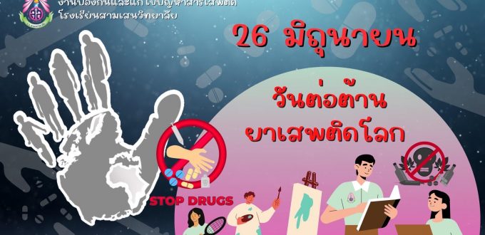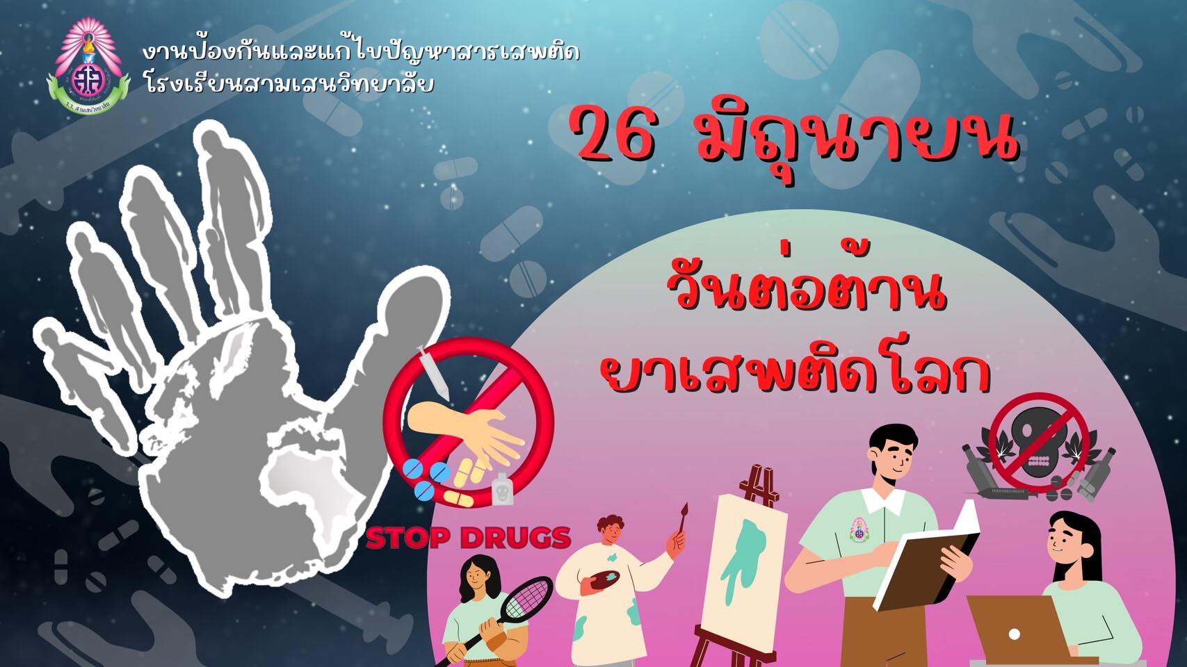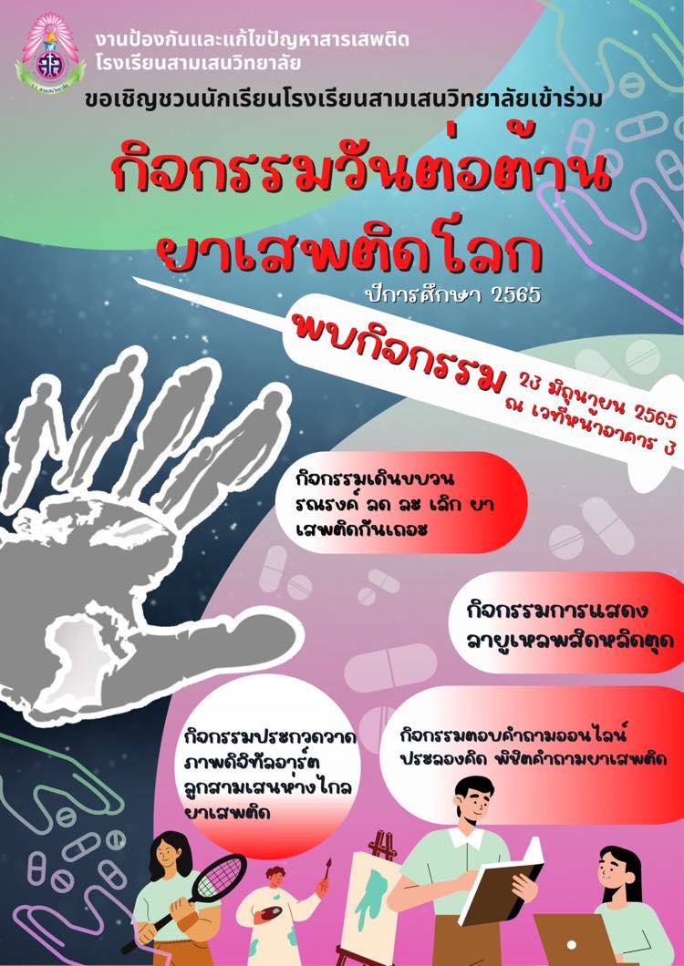 🚩งานป้องกันและแก้ไขปัญหาสารเสพติด 📣 ขอเชิญชวนนักเรียนเข้าร่วมกิจกรรมวันต่อต้านยาเสพติดโลก ปีการศึกษา 2565 พบกับกิจกรรม “เดินขบวนรณรงค์ ลด ละ เลิก ยาเสพติดกันเถอะ” ” การแสดงลายูเหลพสิดหลิดตุด” “การประกวดวาดภาพดิจิทัลอาร์ต ลูกสามเสน ห่างไกลยาเสพติด” และ “ตอบคำถามออนไลน์ ประลองคิด พิชิตคำถามยาเสพติด” ในวันพฤหัสบดีที่ 23 มิถุนายน 2565 เวลา 07.00 น. เป็นต้นไป
