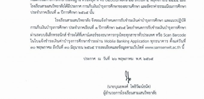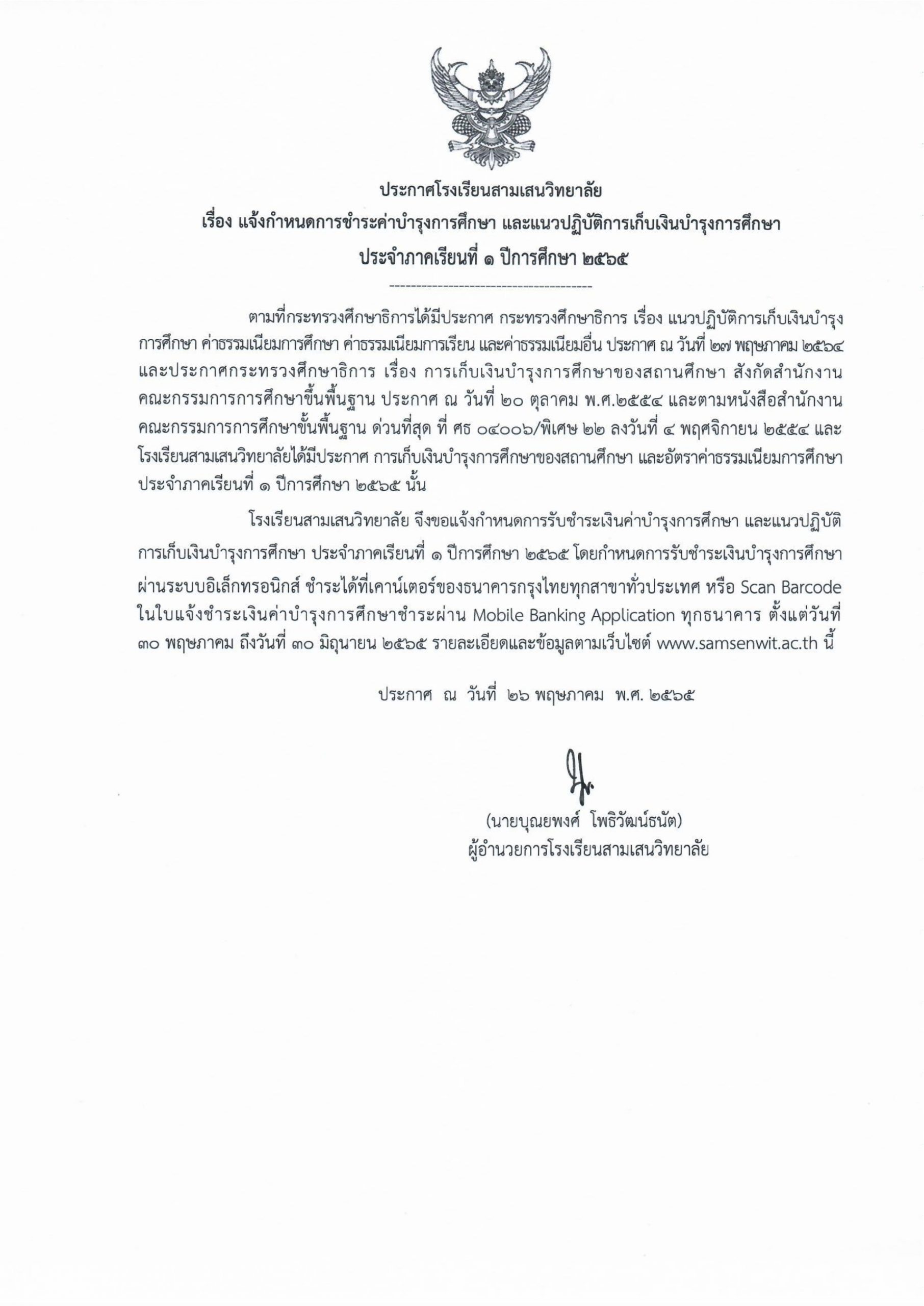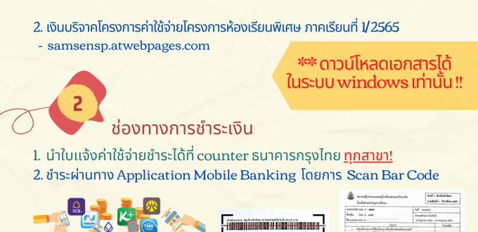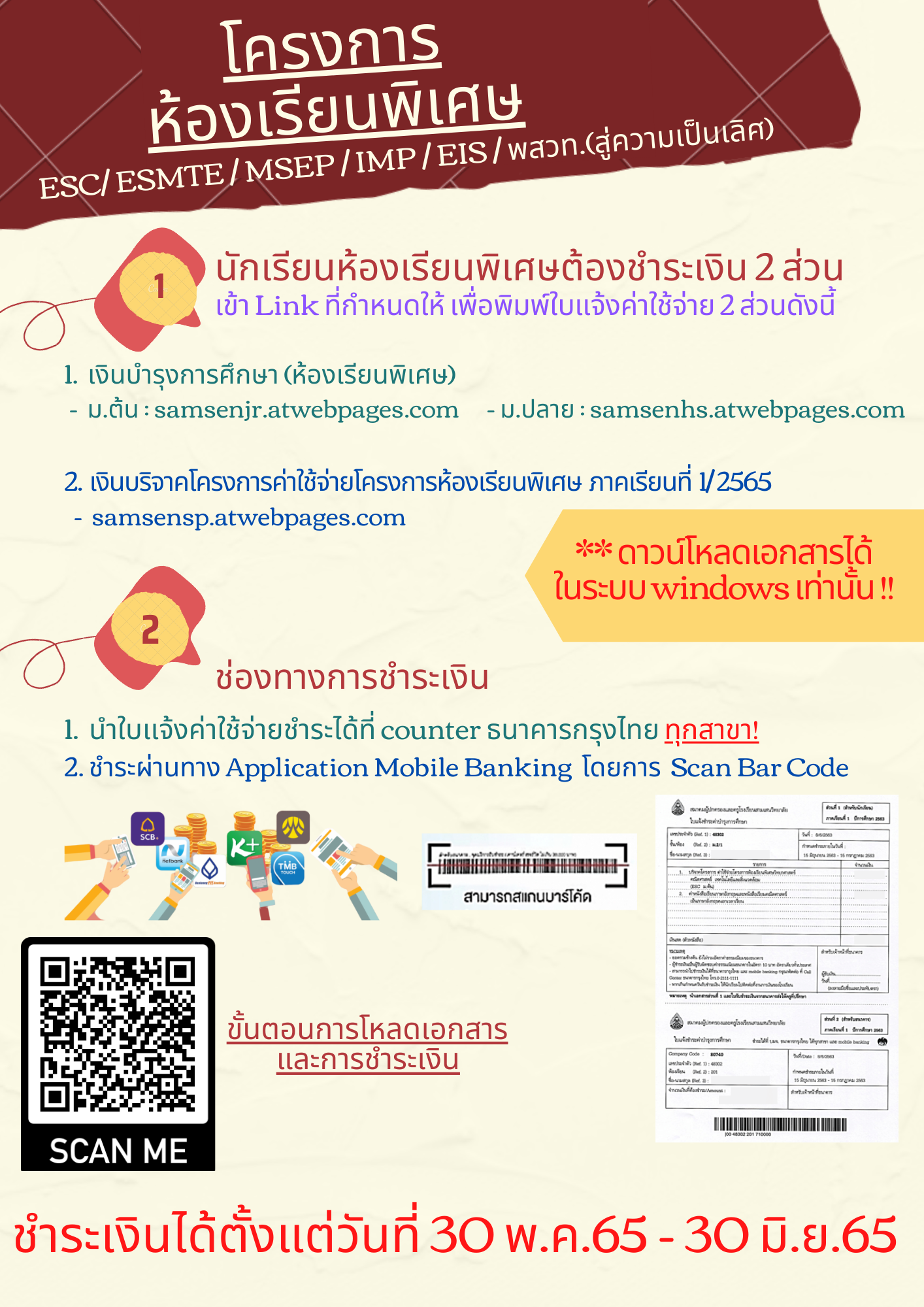 🚩 การชำระเงินนักเรียนโครงการห้องเรียนพิเศษ ภาคเรียนที่ 1 ปีการศึกษา 2565