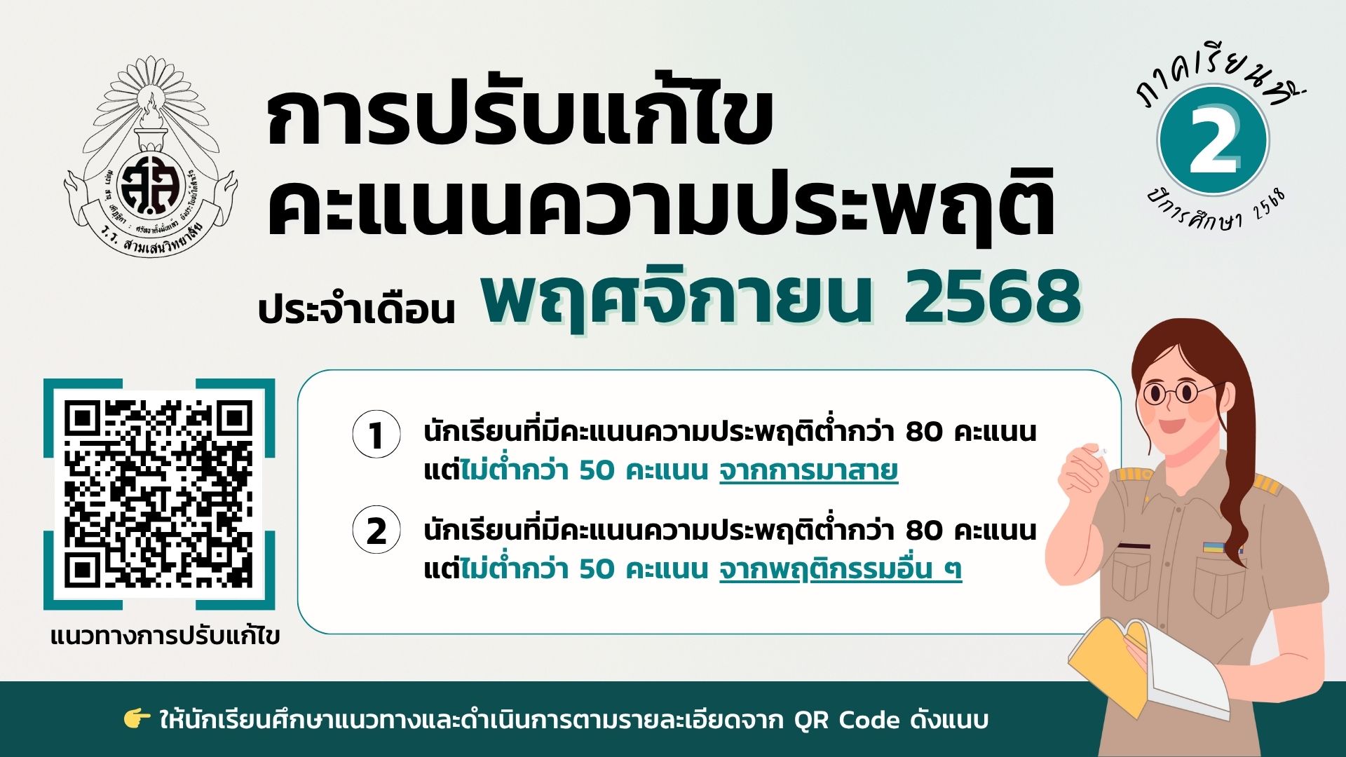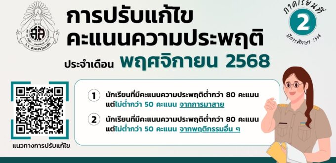 📌 ส่งแบบรายงานการขอปรับแก้ไขคะแนนความประพฤติ (กจ 2- 6) ภายในวันที่ 3 ธันวาคม 2568