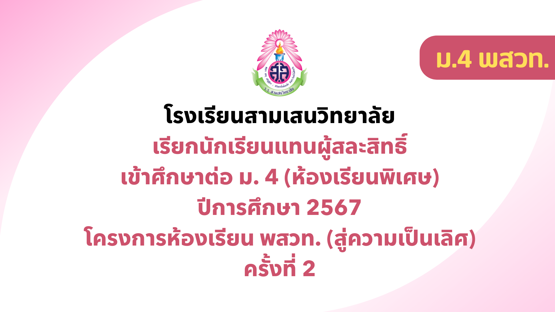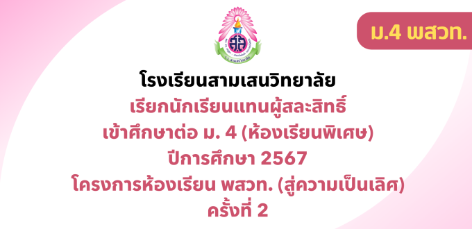 ประกาศโรงเรียนสามเสนวิทยาลัย เรื่อง เรียกนักเรียนแทนผู้สละสิทธิ์เข้าศึกษาต่อชั้นมัธยมศึกษาปีที่ 4 (ห้องเรียนพิเศษ) ปีการศึกษา 2567 โครงการห้องเรียน พสวท. (สู่ความเป็นเลิศ) ครั้งที่ 2 📥ประกาศเรียกสำรอง ม.4 พสวท. (สู่ความเป็นเลิศ) ครั้งที่ 2 🚩 รายงานตัว (ออนไลน์) ⬇️