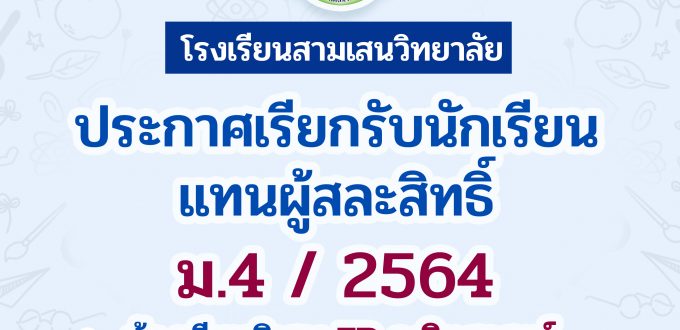 ประกาศเรียกรับนักเรียนแทนผู้สละสิทธิ์ ม.4/2564 ประเภทห้องเรียนปกติ กลุ่มการเรียนวิทยาศาสตร์ และกลุ่มการเรียนคณิตศาสตร์ ครั้งที่ 2 (31 พ.ค. 2564) ประกาศเรียกรับนักเรียนแทนผู้สละสิทธิ์ ม.4 – ปกติ (วิทยาศาสตร์)ดาวน์โหลด ประกาศเรียกรับนักเรียนแทนผู้สละสิทธิ์ ม.4 – ปกติ (คณิตศาสตร์)ดาวน์โหลด ขั้นตอนและเอกสารการมอบตัว